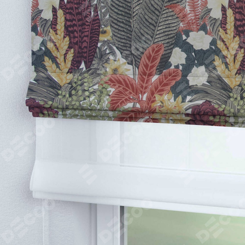 Римская штора день-ночь производителя «Cortin», используется для проёма, пошита из двух полотен, с лицевой стороны «Осень», вторая ткань тюль (по стандарту комплектуется тюль белого цвета артикул V-01). Имеет универсальный механизм и подходит для монтажа: на потолок, на стену и в нишу.