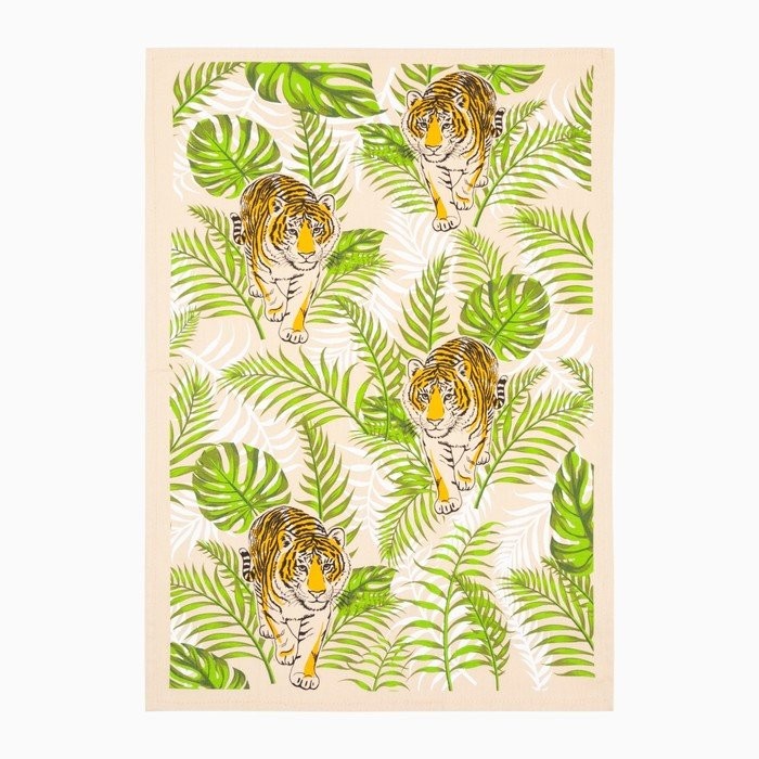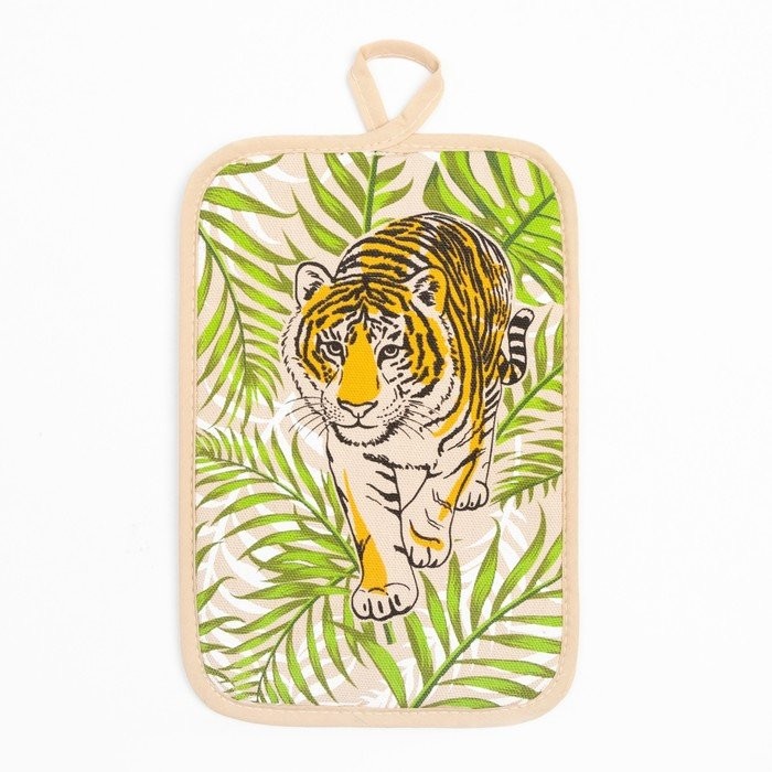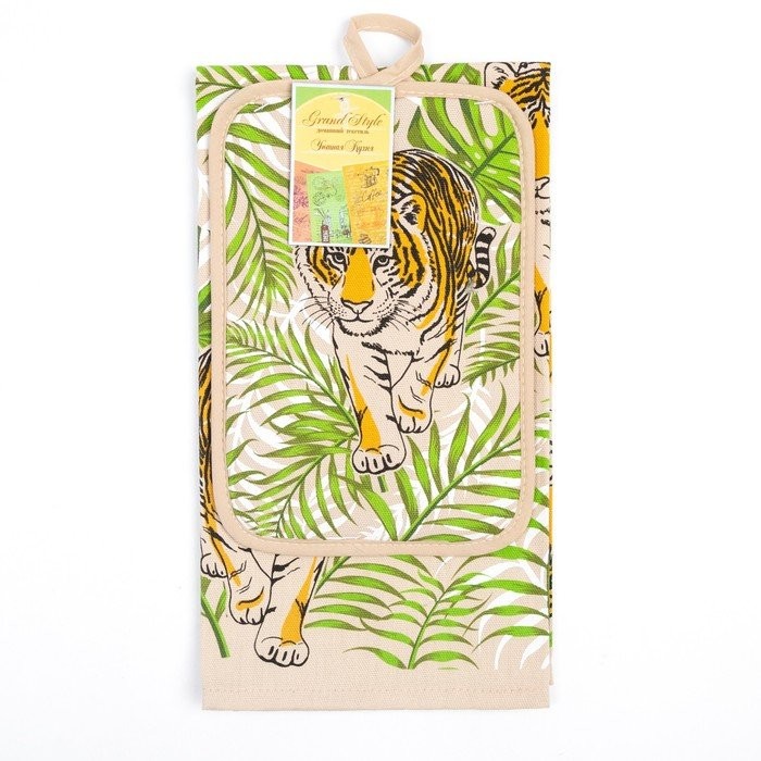 Кухонный набор Тигр в листьях (полотенце 39×60+прихватка 14,5×22), беж, хлопок 100%, 200г/м2