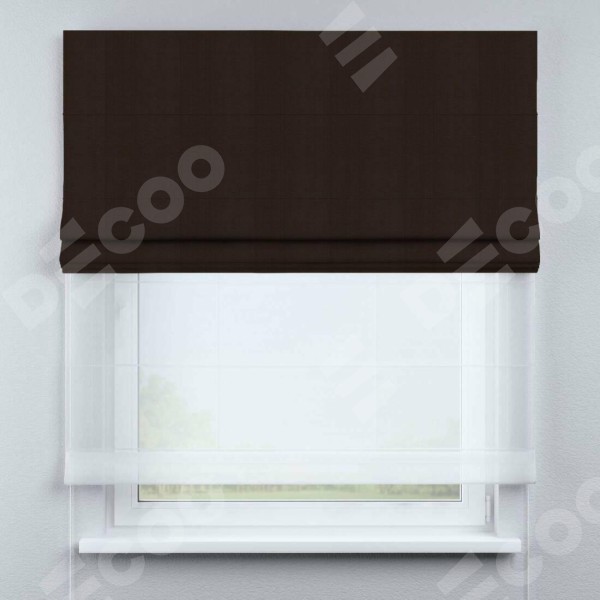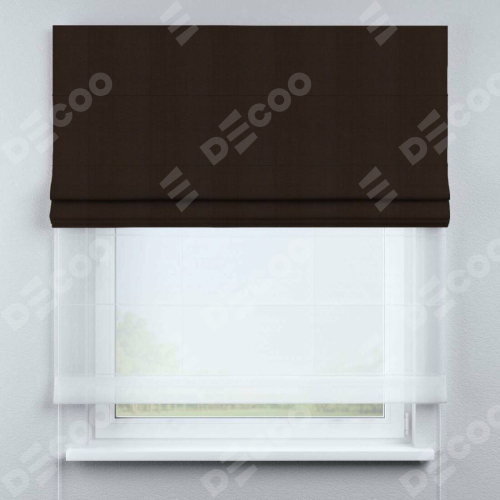 Римская штора день-ночь производителя «Cortin», используется для проёма, пошита из двух полотен, с лицевой стороны блэкаут однотонный тёмно-коричневый артикул 88287, вторая ткань тюль (по стандарту комплектуется тюль белого цвета артикул V-01). Имеет универсальный механизм и подходит для монтажа: на потолок, на стену и в нишу.