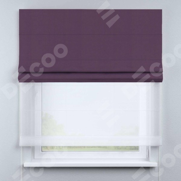 Римская штора день-ночь производителя «Cortin», используется для проёма, пошита из двух полотен, с лицевой стороны блэкаут однотонный фуксия артикул 88303, вторая ткань тюль (по стандарту комплектуется тюль белого цвета артикул V-01). Имеет универсальный механизм и подходит для монтажа: на потолок, на стену и в нишу.