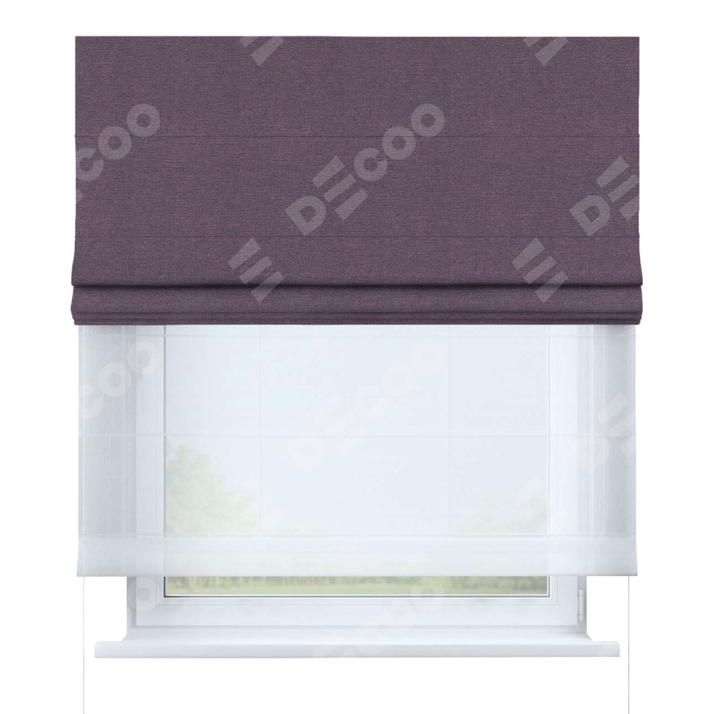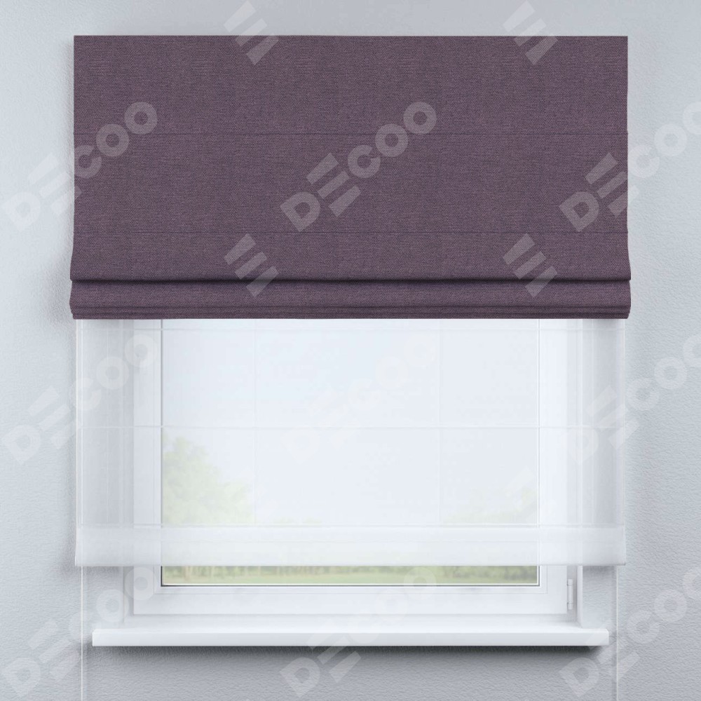 Римская штора день-ночь производителя «Cortin», используется для проёма, пошита из двух полотен, с лицевой стороны лён димаут светло-фиолетовый артикул 83034, вторая ткань тюль (по стандарту комплектуется тюль белого цвета артикул V-01). Имеет универсальный механизм и подходит для монтажа: на потолок, на стену и в нишу.