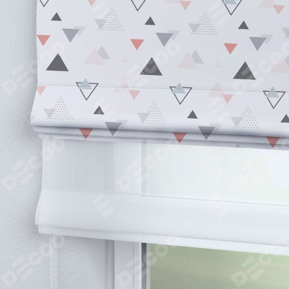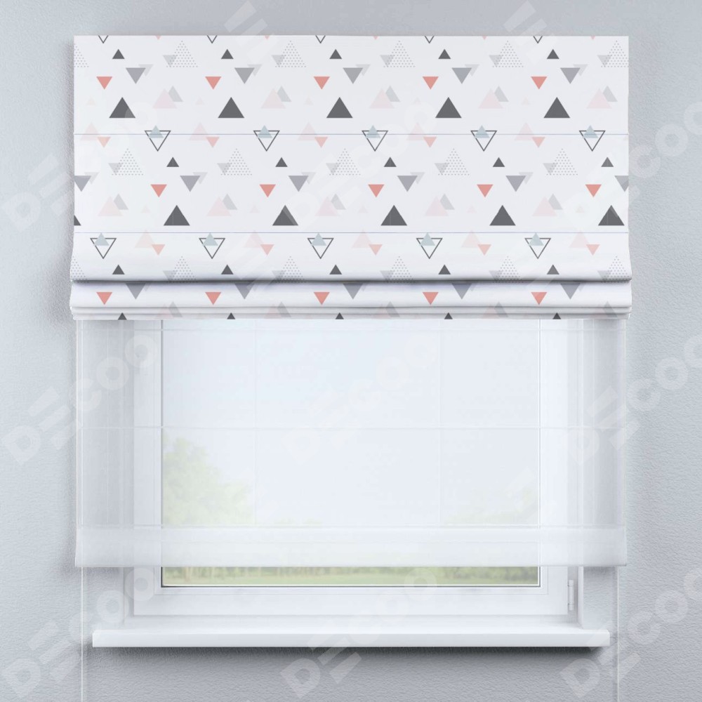 Римская штора день-ночь производителя «Cortin», используется для проёма, пошита из двух полотен, с лицевой блэкаут с нанесением сублимационной печати «Дождь из треугольников», вторая ткань тюль (по стандарту комплектуется тюль белого цвета артикул V-01). Имеет универсальный механизм и подходит для монтажа: на потолок, на стену и в нишу.