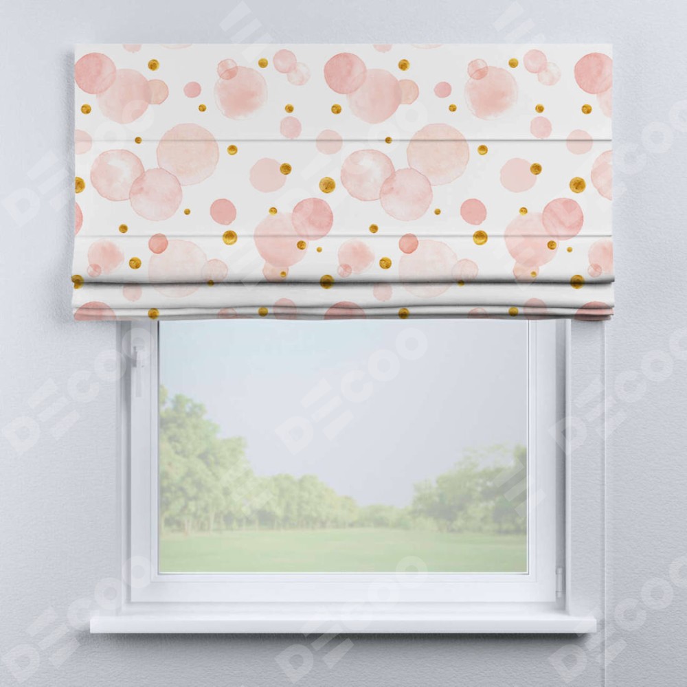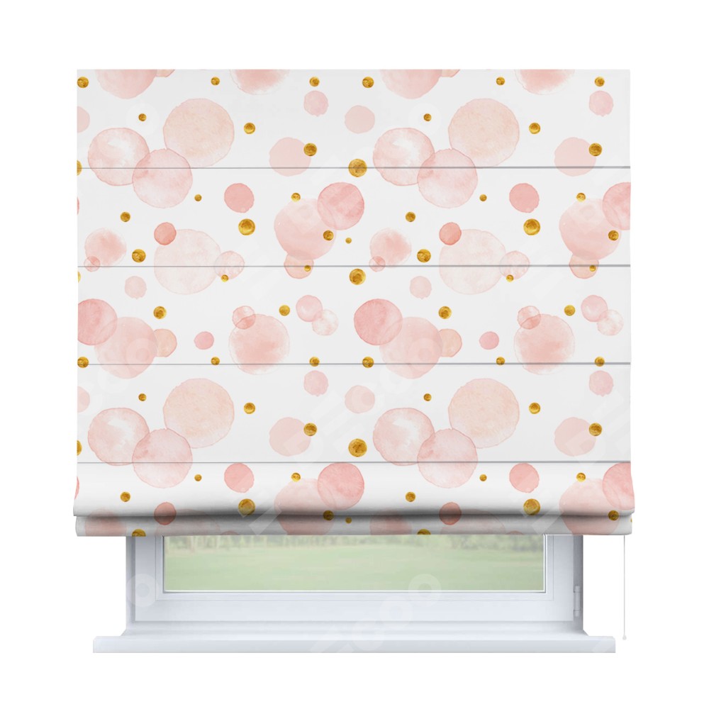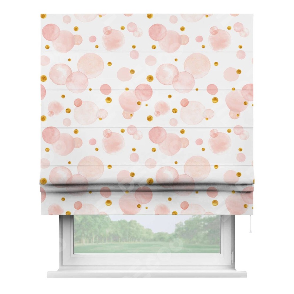 Римская штора производителя «Cortin», используется для проёма, пошита из ткани блэкаут с нанесением сублимационной печати «Круги и точки». Имеет универсальный механизм и подходит для монтажа: на потолок, на стену и в нишу.