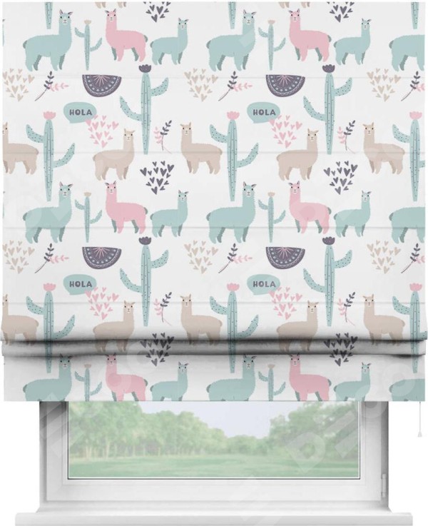 Римская штора производителя «Cortin», используется для проёма, пошита из ткани блэкаут с нанесением сублимационной печати «Милый лама». Имеет универсальный механизм и подходит для монтажа: на потолок, на стену и в нишу.