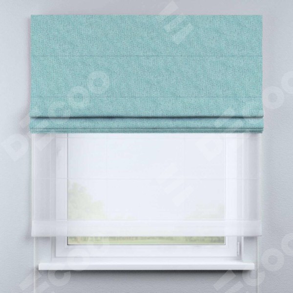 Римская штора день-ночь производителя «Cortin», используется для проёма, пошита из двух полотен, с лицевой стороны лён димаут бирюзовый артикул 23, вторая ткань тюль (по стандарту комплектуется тюль белого цвета артикул V-01). Имеет универсальный механизм и подходит для монтажа: на потолок, на стену и в нишу.