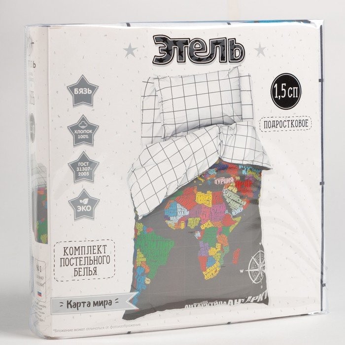 Постельное бельё Этель 1,5 сп «Карта мира» 143×215 см, 150×214 см, 50×70 см -1 шт, 100% хлопок, бязь