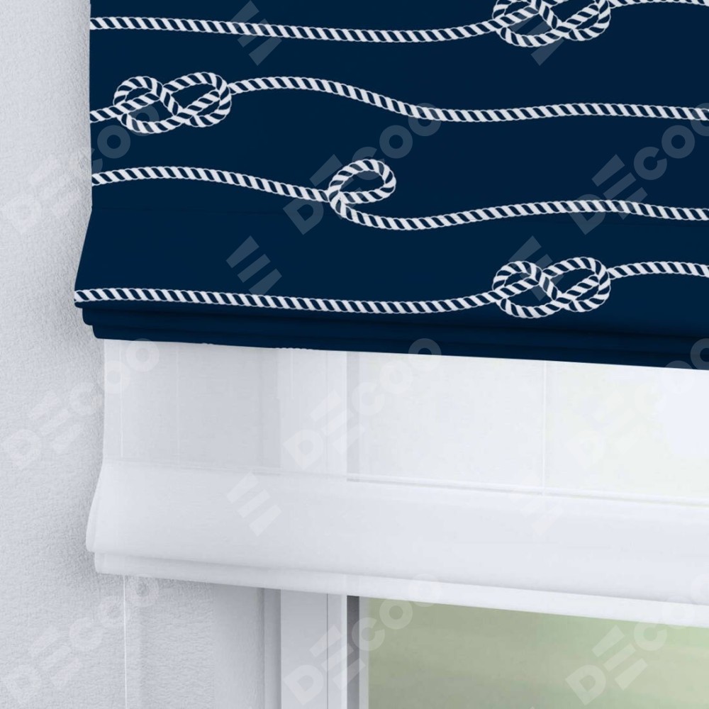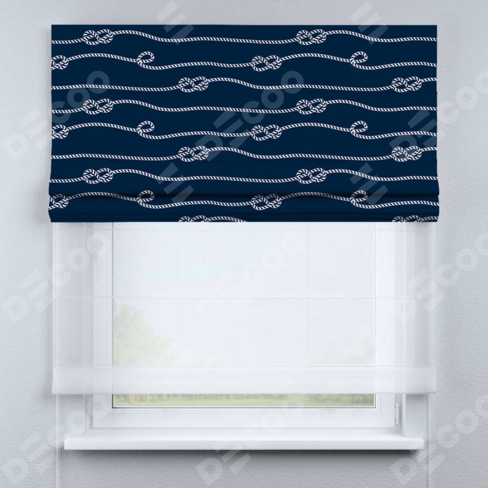 Римская штора день-ночь производителя «Cortin», используется для проёма, пошита из двух полотен, с лицевой блэкаут с нанесением сублимационной печати «Морской узел», вторая ткань тюль (по стандарту комплектуется тюль белого цвета артикул V-01). Имеет универсальный механизм и подходит для монтажа: на потолок, на стену и в нишу.
