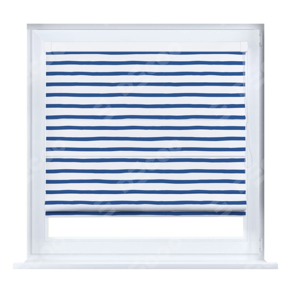 Римская штора кассетного типа, производителя «Cortin», устанавливается только на пластиковые окна и прилегает к стеклопакету, пошита из ткани блэкаут с нанесением сублимационной печати «Морская полоска».