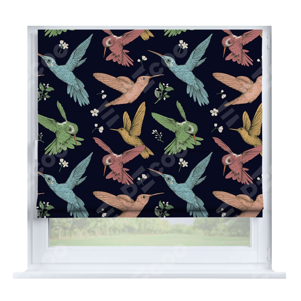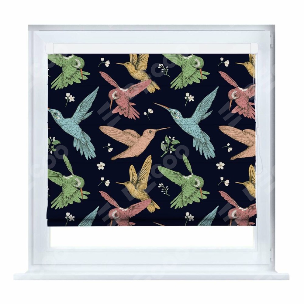 Римская штора производителя «Cortin», устанавливается на створку окна, пошита из ткани блэкаут с нанесением сублимационной печати «Птицы и цветы». Штора шьётся по индивидуальным размерам, для данного типа римской шторы возможная ширина от 35 до 150 см., высота до 250 см.