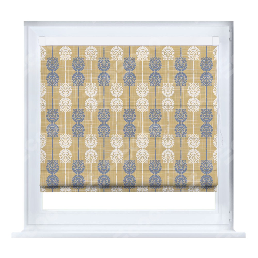 Римская штора кассетного типа, производителя «Cortin», устанавливается только на пластиковые окна и прилегает к стеклопакету, пошита из ткани блэкаут с нанесением сублимационной печати «Венок из ромашки».
