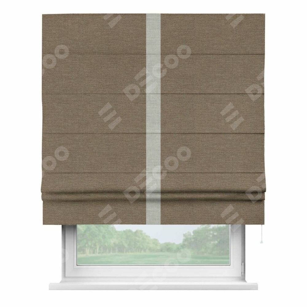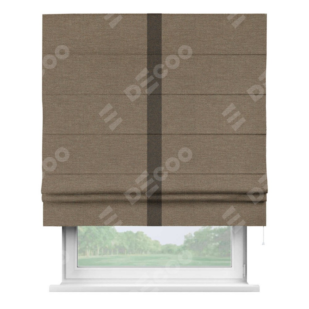 Римская штора производителя «Cortin», используется для проёма, пошита из ткани лён светло-коричневый, артикул 53434. Отделка шторы кантом «Хайвэй», ткань для канта используется из льна разной расцветки на выбор. Имеет универсальный механизм и подходит для монтажа: на потолок, на стену и в нишу.