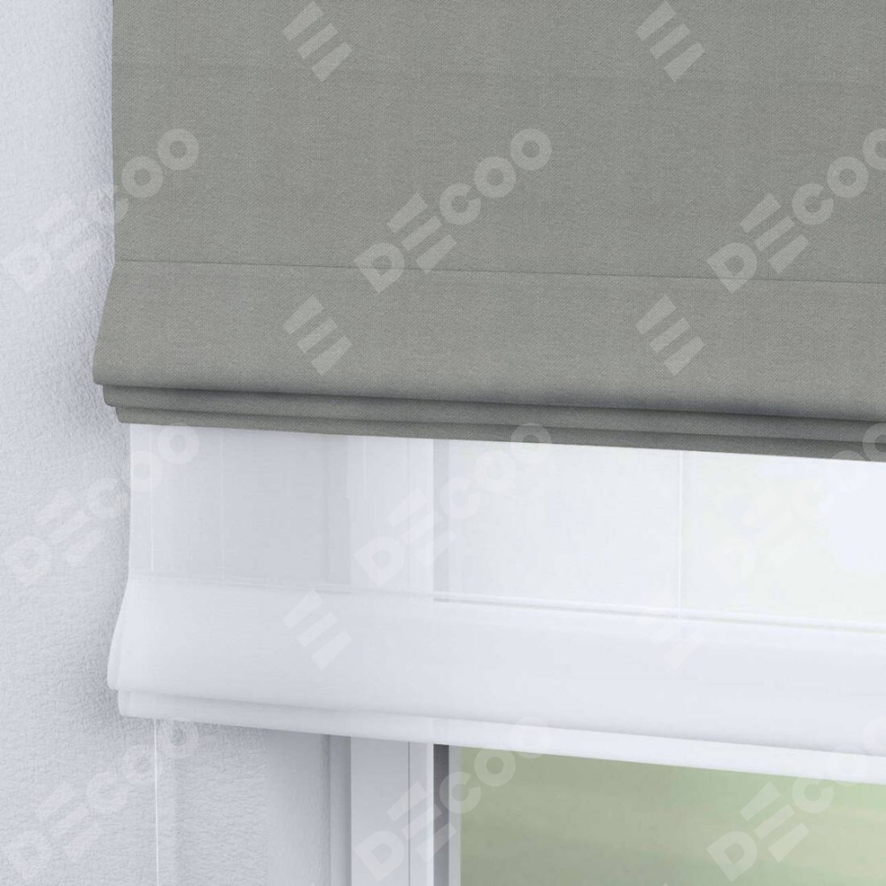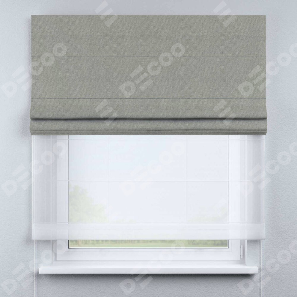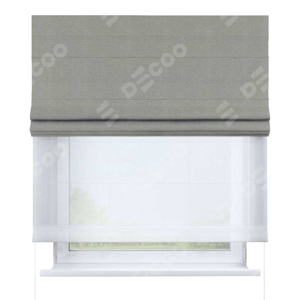 Римская штора день-ночь производителя «Cortin», используется для проёма, пошита из двух полотен, с лицевой стороны лён димаут серый артикул 00001, вторая ткань тюль (по стандарту комплектуется тюль белого цвета артикул V-01). Имеет универсальный механизм и подходит для монтажа: на потолок, на стену и в нишу.