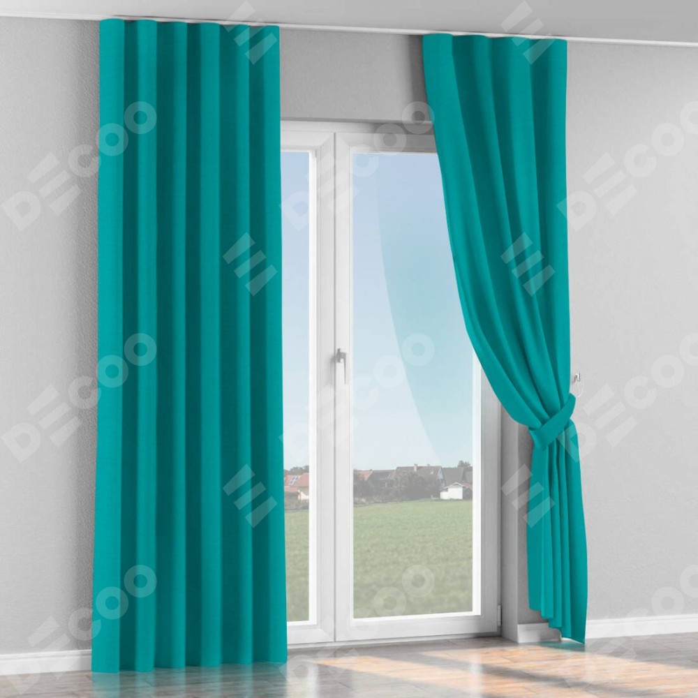 Комплект прямых штор, от производителя «Cortin», пошиты из ткани блэкаут однотонный бирюзовый, артикул ткани 88297. С изнаночной стороны в верхней части штор пристрачивается шторная лента с декоративными складками «Волна». Для создания элегантных складок прямые шторы шьются по стандарту с коэффициентом 1:2 (на 100 см. ширины проёма 200 см. ширины ткани).