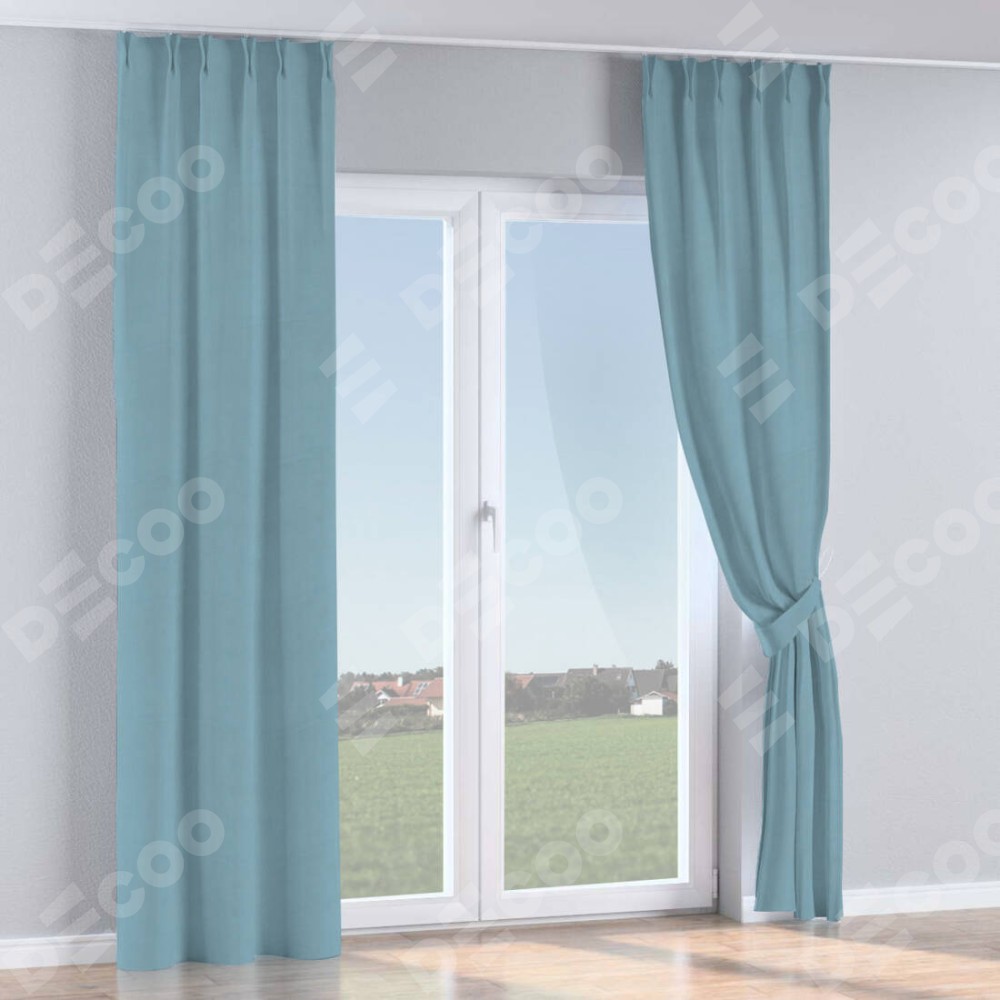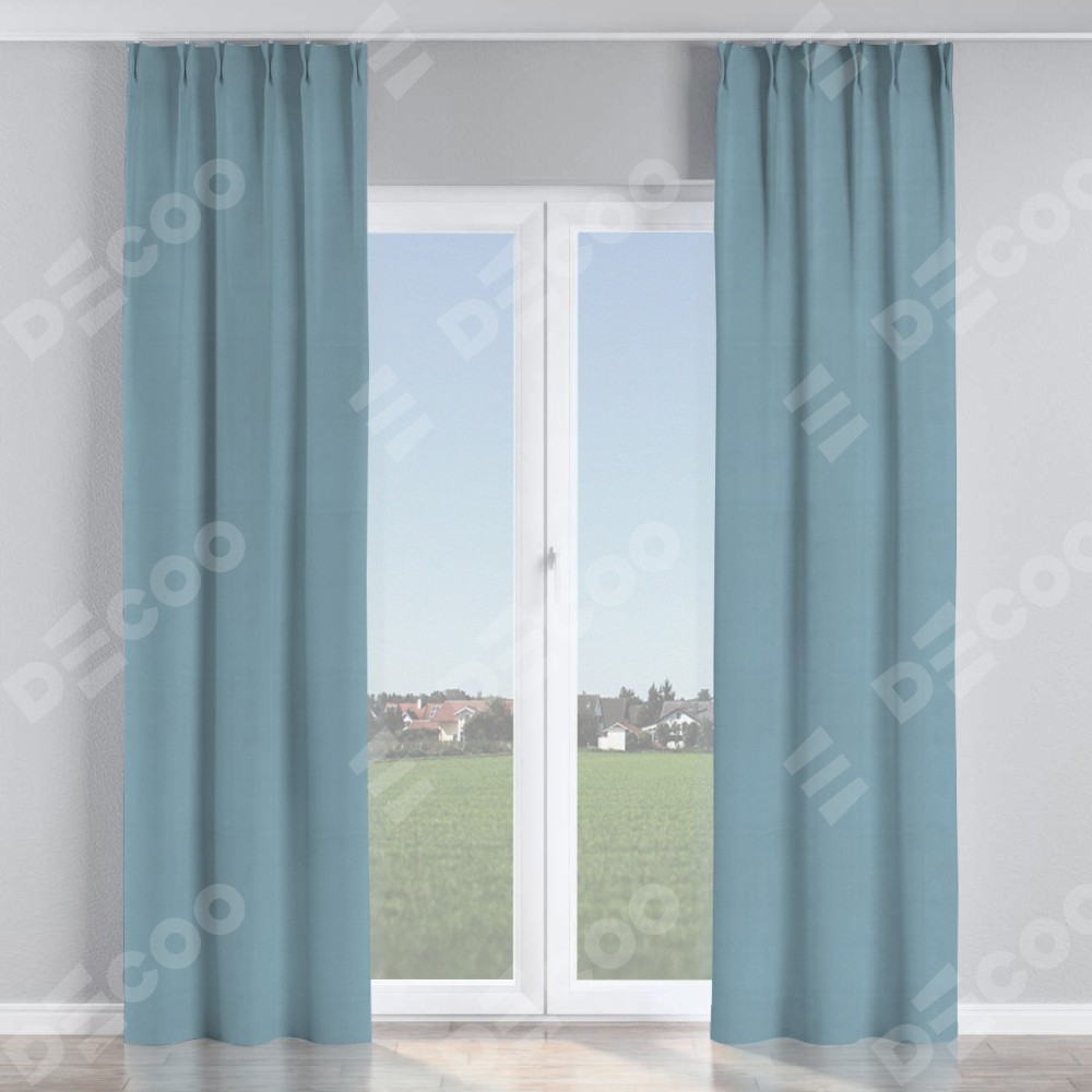 Комплект прямых штор, от производителя «Cortin», пошиты из ткани блэкаут однотонный серо-голубой, артикул ткани 29327. С изнаночной стороны в верхней части штор пристрачивается шторная лента с декоративными складками «Кустик». Для создания элегантных складок прямые шторы шьются по стандарту с коэффициентом 1:2 (на 100 см. ширины проёма 200 см. ширины ткани).