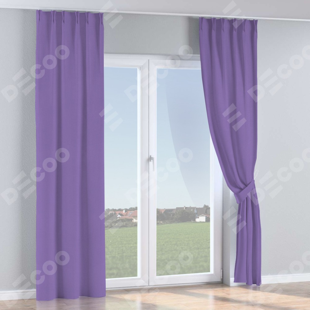 Комплект прямых штор, от производителя «Cortin», пошиты из ткани блэкаут однотонный сиреневый, артикул ткани 88305. С изнаночной стороны в верхней части штор пристрачивается шторная лента с декоративными складками «Кустик». Для создания элегантных складок прямые шторы шьются по стандарту с коэффициентом 1:2 (на 100 см. ширины проёма 200 см. ширины ткани).