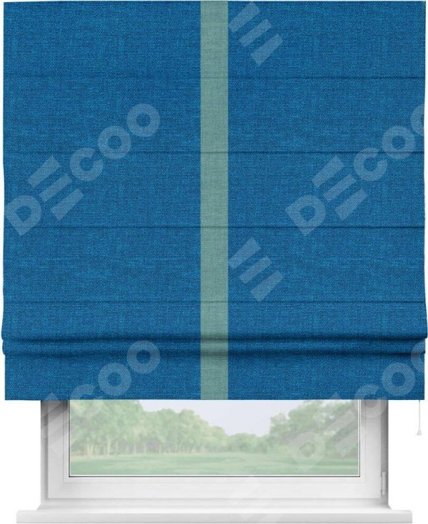 Римская штора производителя «Cortin», используется для проёма, пошита из ткани лён синий, артикул 63742. Отделка шторы кантом «Хайвэй», ткань для канта используется из льна разной расцветки на выбор. Имеет универсальный механизм и подходит для монтажа: на потолок, на стену и в нишу.