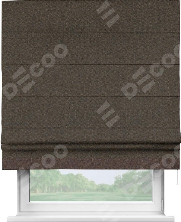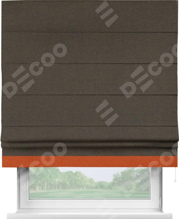 Римская штора производителя «Cortin», используется для проёма, пошита из ткани лён темно-коричневый, артикул 53444. Отделка шторы кантом «Джестер», ткань для канта используется из льна разной расцветки на выбор. Имеет универсальный механизм и подходит для монтажа: на потолок, на стену и в нишу.