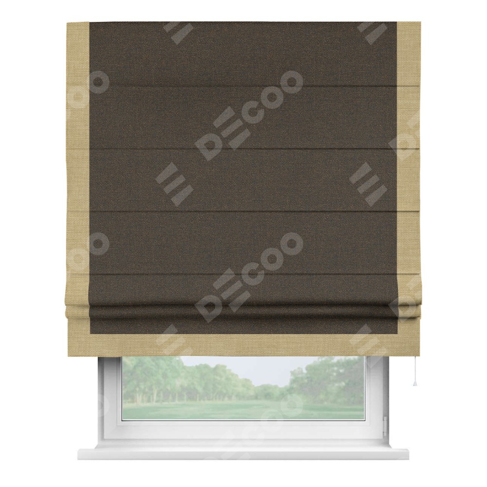 Римская штора производителя «Cortin», используется для проёма, пошита из ткани лён темно-коричневый, артикул 53444. Отделка шторы кантом «Виктория», ткань для канта используется из льна разной расцветки на выбор. Имеет универсальный механизм и подходит для монтажа: на потолок, на стену и в нишу.