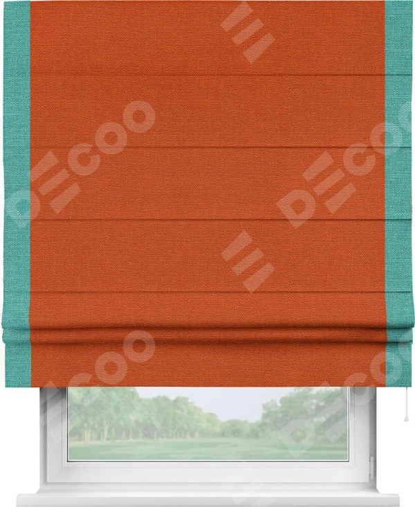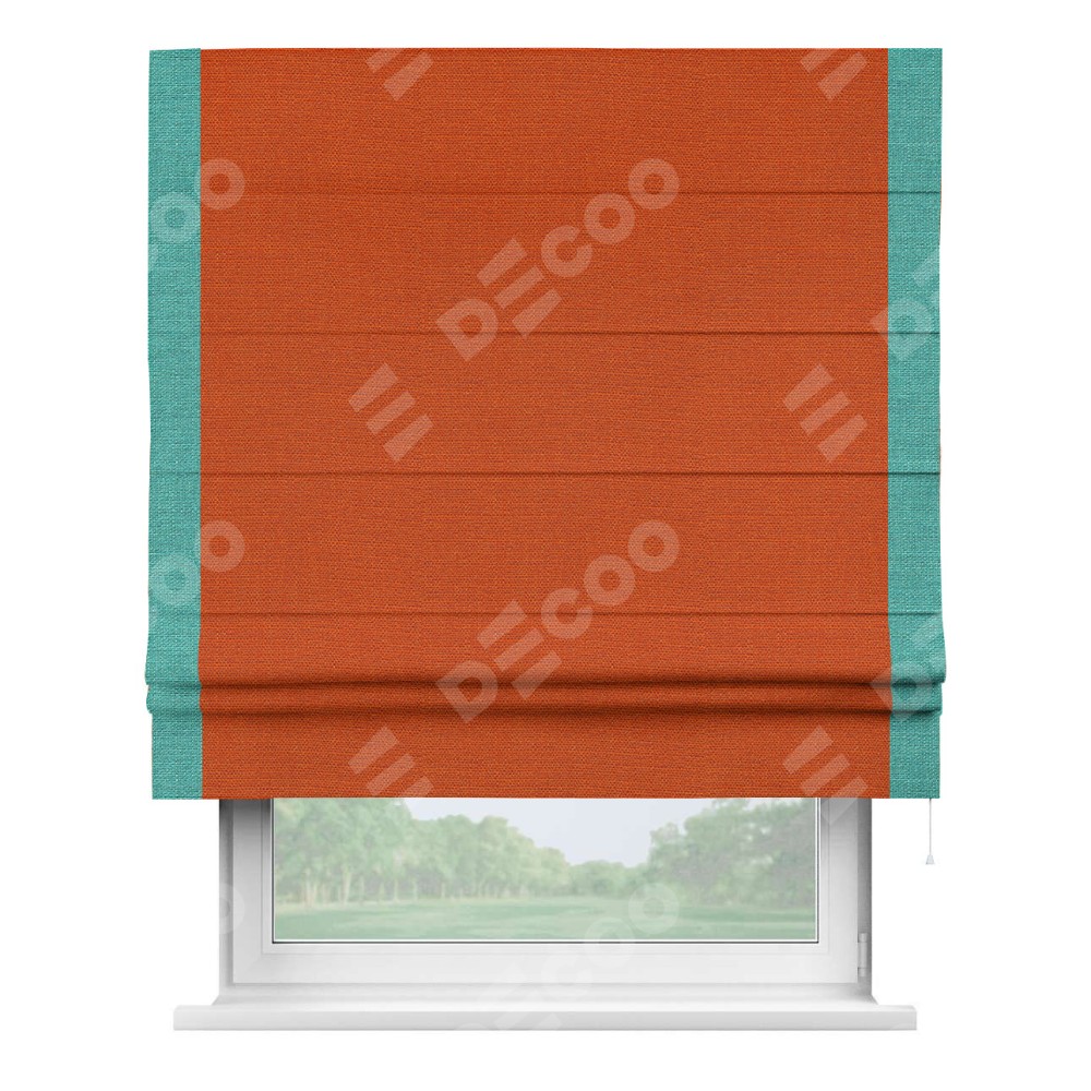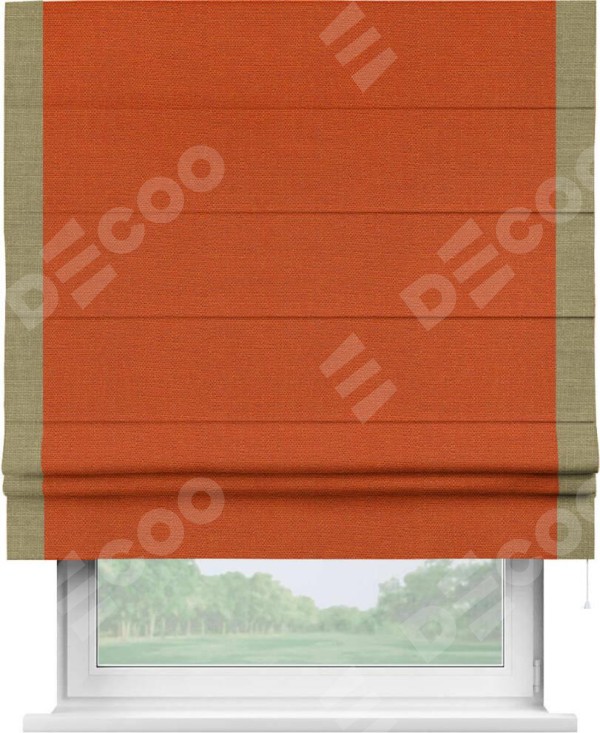 Римская штора производителя «Cortin», используется для проёма, пошита из ткани лён терракотовый, артикул 53440. Отделка шторы кантом «Стрим Дуо», ткань для канта используется из льна разной расцветки на выбор. Имеет универсальный механизм и подходит для монтажа: на потолок, на стену и в нишу.