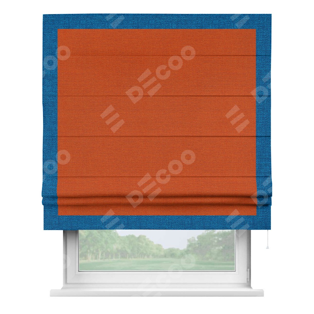 Римская штора производителя «Cortin», используется для проёма, пошита из ткани лён терракотовый, артикул 53440. Отделка шторы кантом «Чесс», ткань для канта используется из льна разной расцветки на выбор. Имеет универсальный механизм и подходит для монтажа: на потолок, на стену и в нишу.