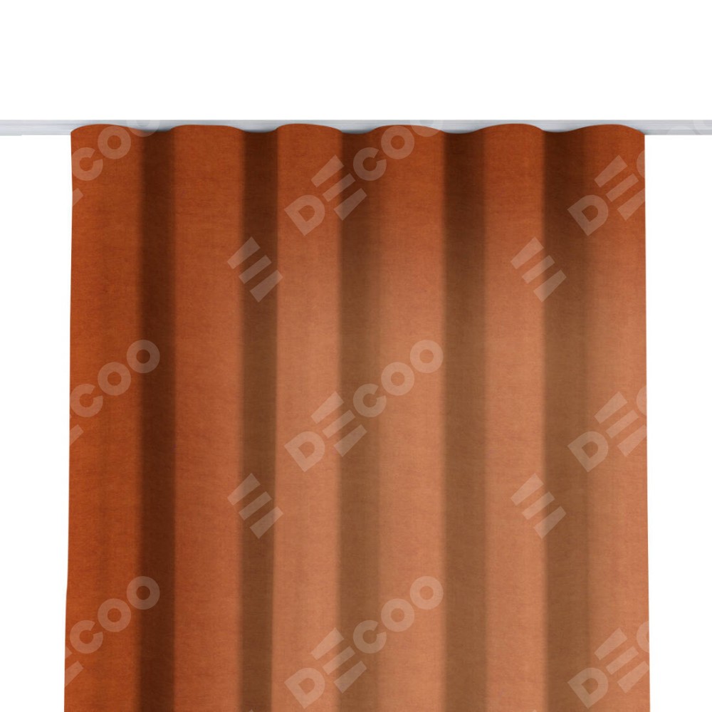 Комплект прямых штор, от производителя «Cortin», пошиты из ткани вельвет терракотовый, артикул ткани 85548. С изнаночной стороны в верхней части штор пристрачивается шторная лента с декоративными складками «Волна». Для создания элегантных складок прямые шторы шьются по стандарту с коэффициентом 1:2 (на 100 см. ширины проёма 200 см. ширины ткани).