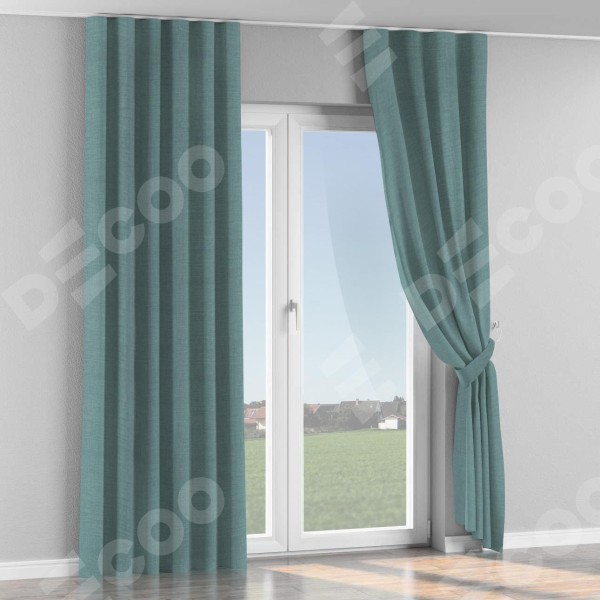 Комплект прямых штор, от производителя «Cortin», пошиты из ткани лён голубой, артикул ткани 74736. С изнаночной стороны в верхней части штор пристрачивается шторная лента с декоративными складками «Волна». Для создания элегантных складок прямые шторы шьются по стандарту с коэффициентом 1:2 (на 100 см. ширины проёма 200 см. ширины ткани).