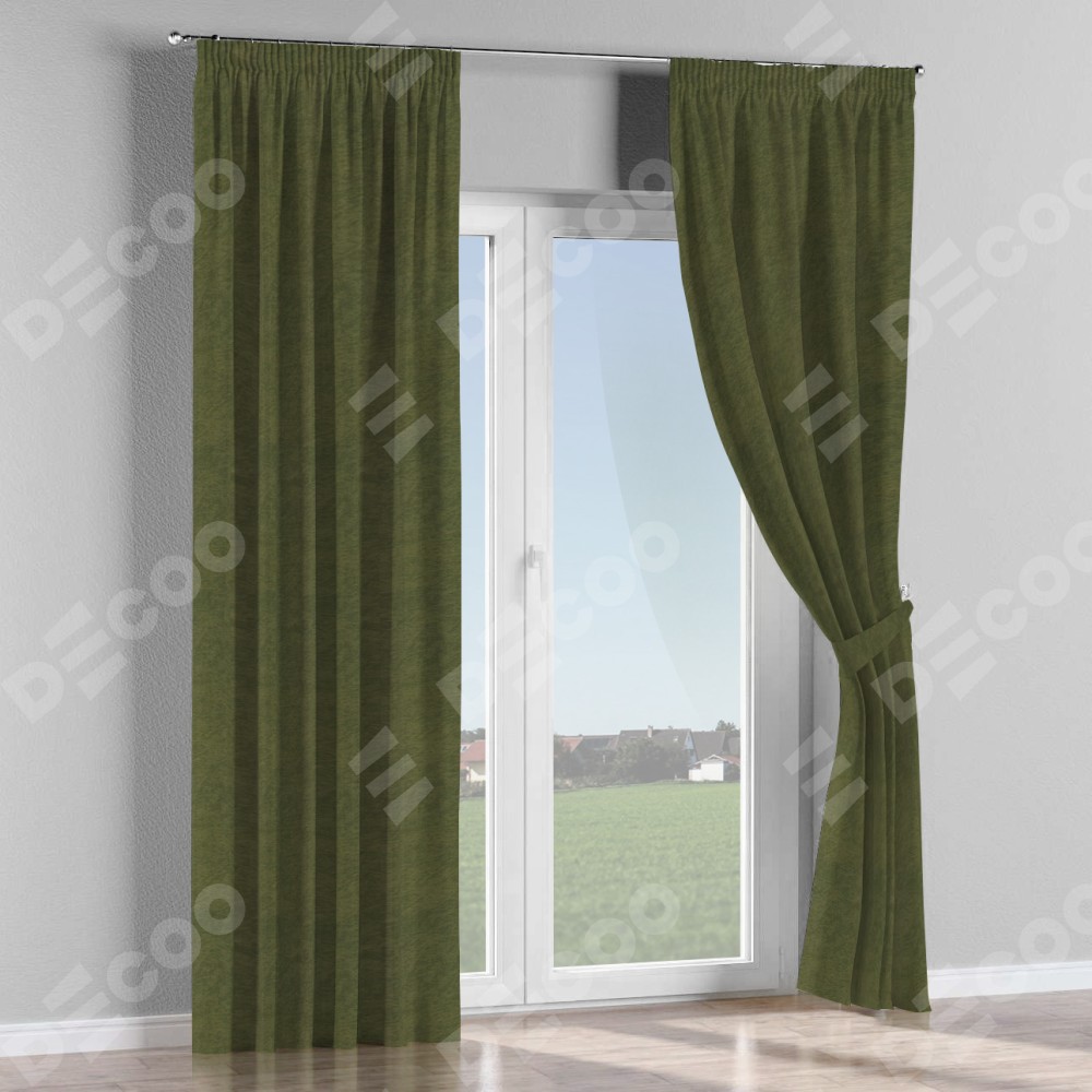 Комплект прямых штор, от производителя «Cortin», пошиты из ткани софт однотонный зелёный, артикул ткани 33110. С изнаночной стороны в верхней части штор пристрачивается шторная лента с декоративными складками «Карандаш». Для создания элегантных складок прямые шторы шьются по стандарту с коэффициентом 1:2 (на 100 см. ширины проёма 200 см. ширины ткани).