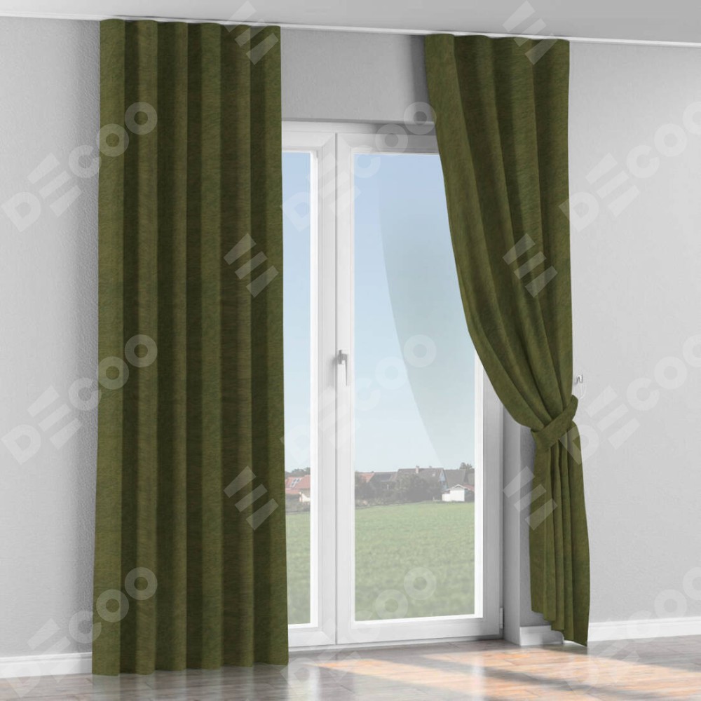 Комплект прямых штор, от производителя «Cortin», пошиты из ткани софт однотонный зелёный, артикул ткани 33110. С изнаночной стороны в верхней части штор пристрачивается шторная лента с декоративными складками «Волна». Для создания элегантных складок прямые шторы шьются по стандарту с коэффициентом 1:2 (на 100 см. ширины проёма 200 см. ширины ткани).