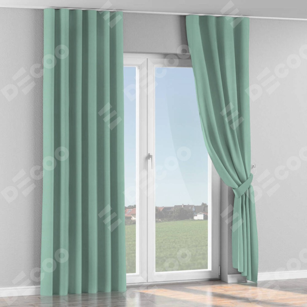Комплект прямых штор, от производителя «Cortin», пошиты из ткани блэкаут однотонный ментоловый, артикул ткани 29584. С изнаночной стороны в верхней части штор пристрачивается шторная лента с декоративными складками «Волна». Для создания элегантных складок прямые шторы шьются по стандарту с коэффициентом 1:2 (на 100 см. ширины проёма 200 см. ширины ткани).