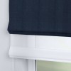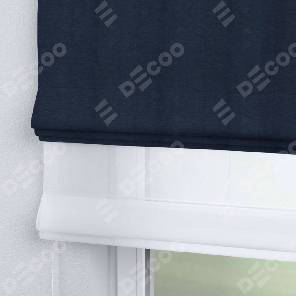 Римская штора день-ночь производителя «Cortin», используется для проёма, пошита из двух полотен, с лицевой стороны софт однотонный тёмно-синий артикул 33111, вторая ткань тюль (по стандарту комплектуется тюль белого цвета артикул V-01). Имеет универсальный механизм и подходит для монтажа: на потолок, на стену и в нишу.