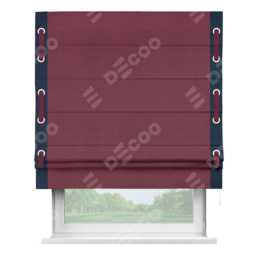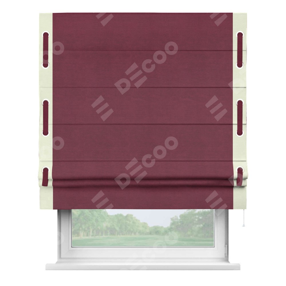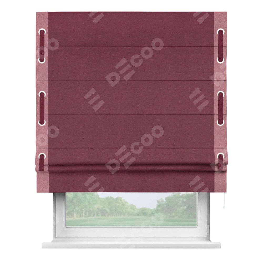 Римская штора производителя «Cortin», используется для проёма, пошита из ткани вельвет бордовый, артикул ткани 85553. Отделка шторы кантом «Стрим Дуо» на кантах расположены люверсы с пояском, ткань для канта используется из вельвета разной расцветки на выбор. Ткань для пояска обычно используется из основной ткани шторы, а так же можно сделать из любой расцветки по желанию. Имеет универсальный механизм и подходит для монтажа: на потолок, на стену и в нишу.