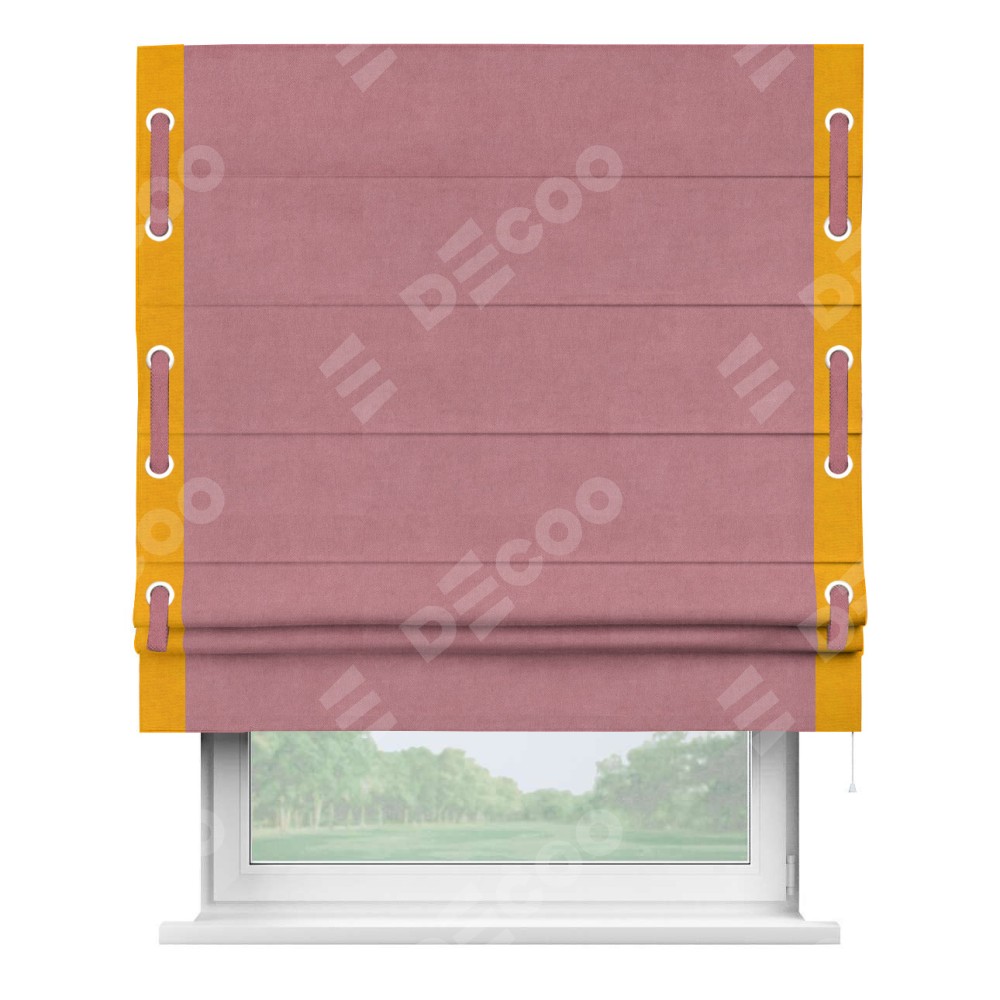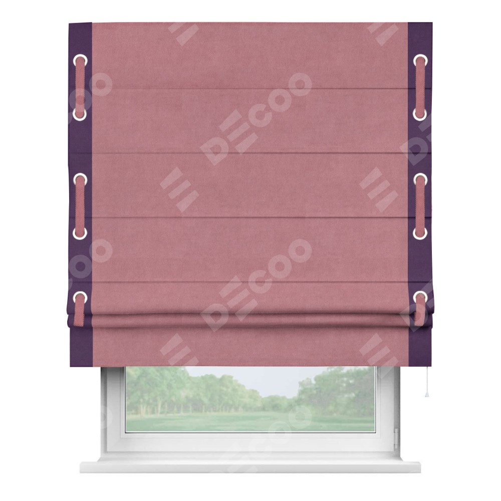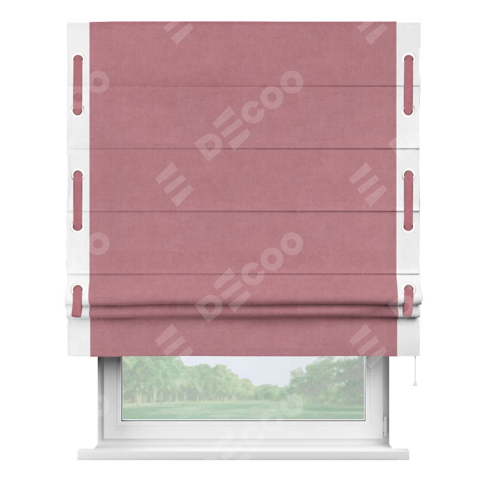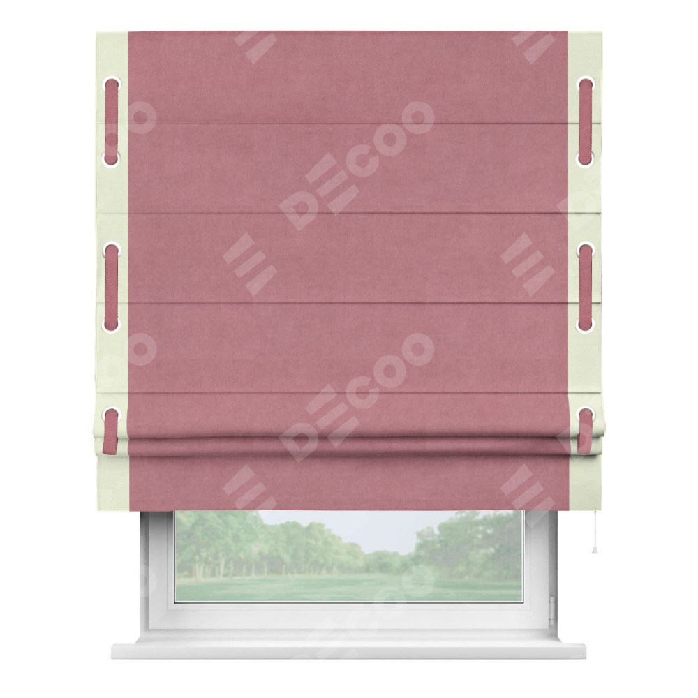 Римская штора производителя «Cortin», используется для проёма, пошита из ткани вельвет брусника, артикул ткани 85550. Отделка шторы кантом «Стрим Дуо» на кантах расположены люверсы с пояском, ткань для канта используется из вельвета разной расцветки на выбор. Ткань для пояска обычно используется из основной ткани шторы, а так же можно сделать из любой расцветки по желанию. Имеет универсальный механизм и подходит для монтажа: на потолок, на стену и в нишу.