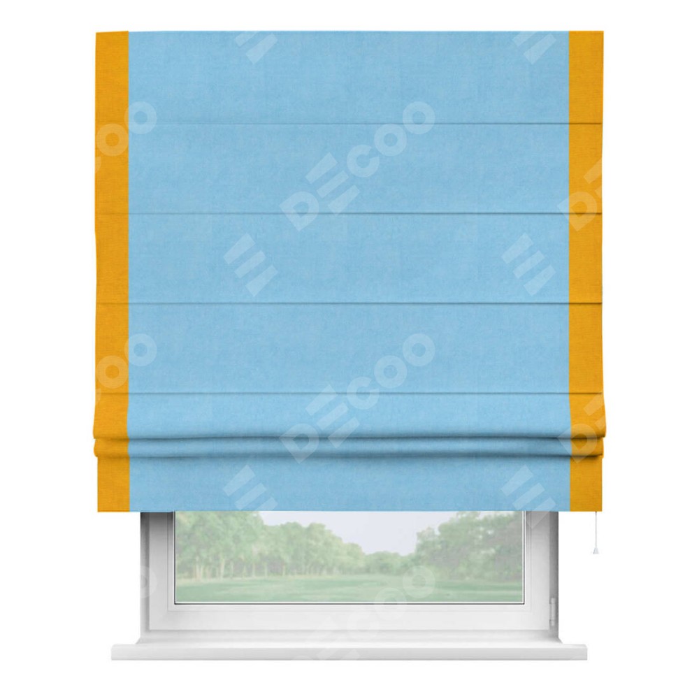 Римская штора производителя «Cortin», используется для проёма, пошита из ткани вельвет голубой, артикул ткани 85544. Отделка шторы кантом «Стрим Дуо», ткань для канта используется из вельвета разной расцветки на выбор. Имеет универсальный механизм и подходит для монтажа: на потолок, на стену и в нишу.