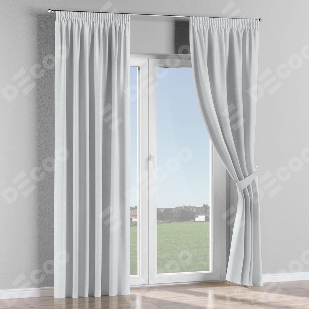 Комплект прямых штор, от производителя «Cortin», пошиты из ткани блэкаут однотонный дымчато-белый, артикул ткани 101. С изнаночной стороны в верхней части штор пристрачивается шторная лента с декоративными складками «Карандаш». Для создания элегантных складок прямые шторы шьются по стандарту с коэффициентом 1:2 (на 100 см. ширины проёма 200 см. ширины ткани).