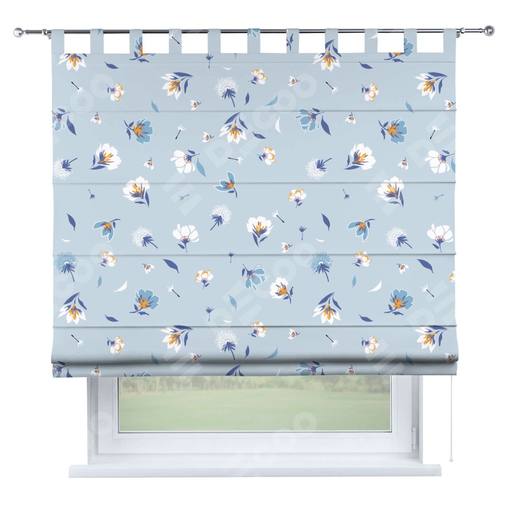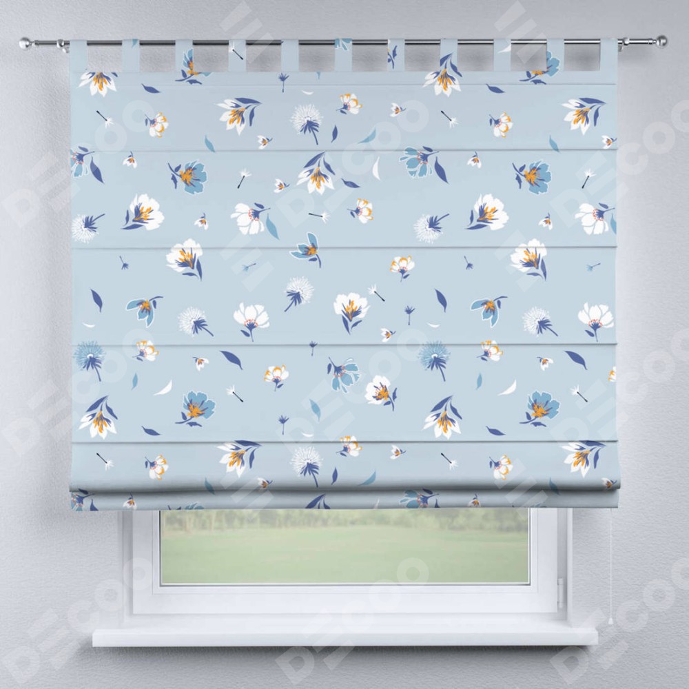 Римская штора производителя «Cortin», используется для проёма, пошита из ткани блэкаут с нанесением сублимационной печати «Голубые цветы». Данная модель пошита на петлях, комплектуется на выбор круглым карнизом и подходит для монтажа на стену. Римская штора на петлях имеет простую систему регулировки высоты, отличительным преимуществом данной модели является простой способ монтажа. Достаточно повесить ее на трубу и штора готова!