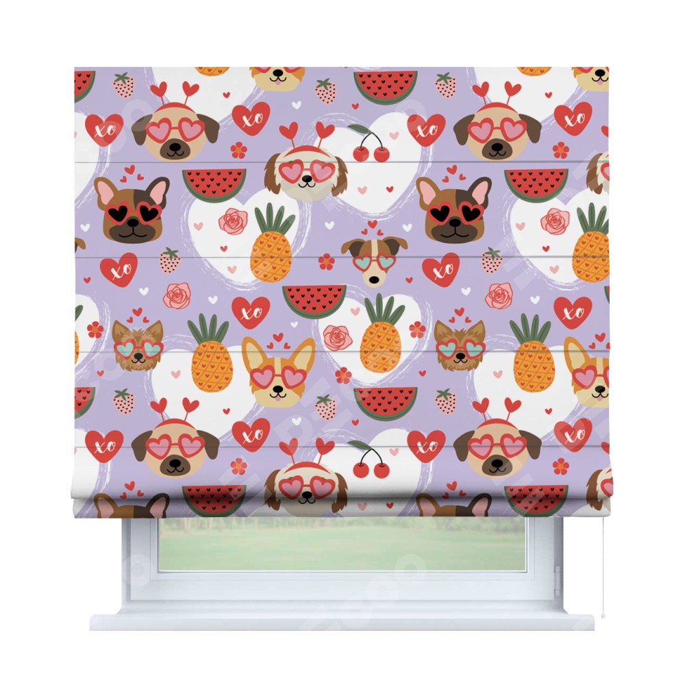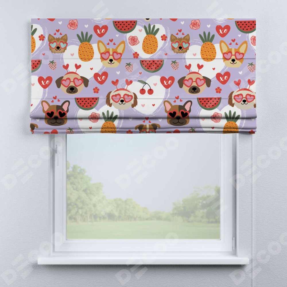 Римская штора производителя «Cortin», используется для проёма, пошита из ткани блэкаут с нанесением сублимационной печати «Забавные собачки». Имеет универсальный механизм и подходит для монтажа: на потолок, на стену и в нишу.