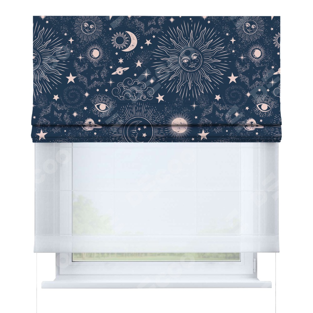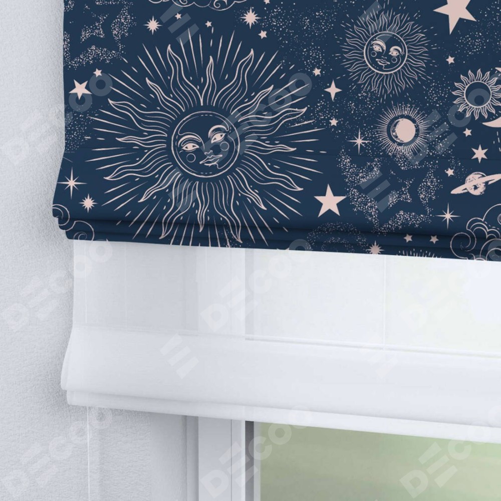 Римская штора день-ночь производителя «Cortin», используется для проёма, пошита из двух полотен, с лицевой блэкаут с нанесением сублимационной печати «Звёзды и планеты», вторая ткань тюль (по стандарту комплектуется тюль белого цвета артикул V-01). Имеет универсальный механизм и подходит для монтажа: на потолок, на стену и в нишу.