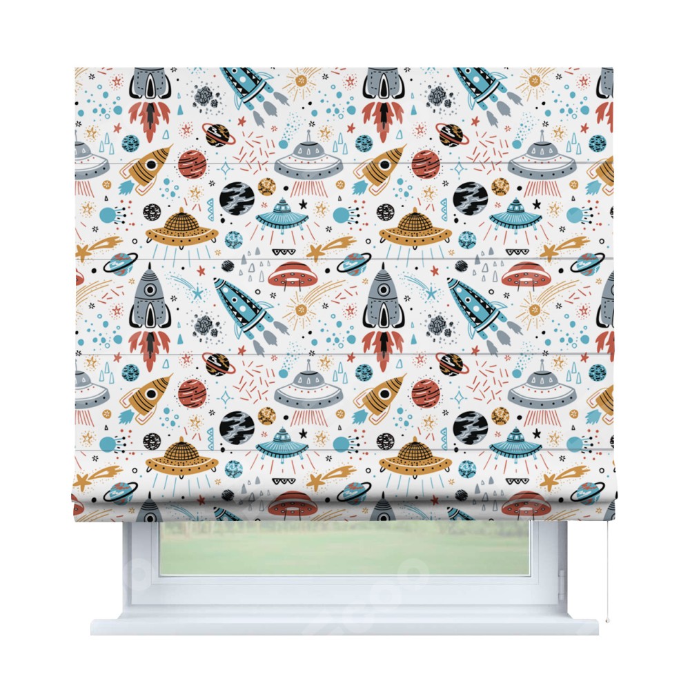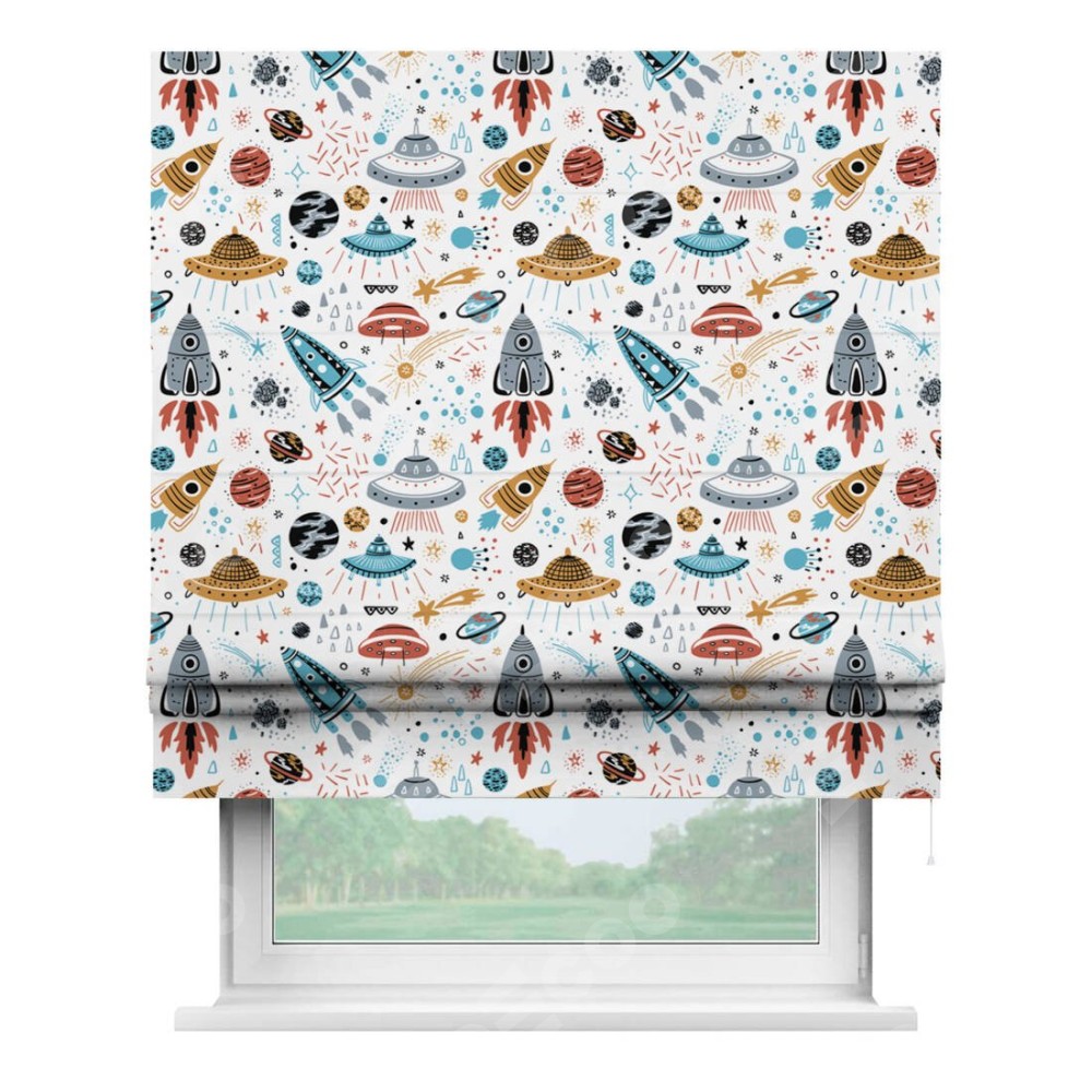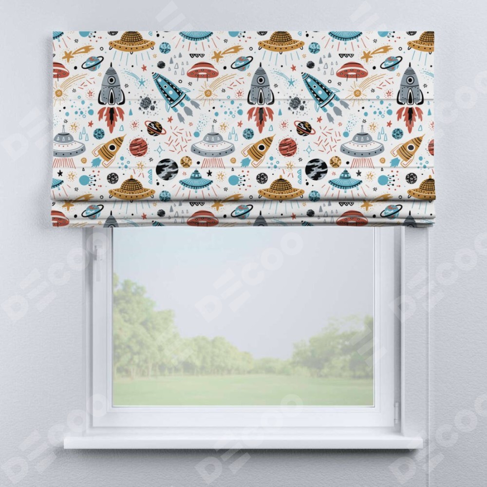 Римская штора производителя «Cortin», используется для проёма, пошита из ткани блэкаут с нанесением сублимационной печати «Космическое приключение». Имеет универсальный механизм и подходит для монтажа: на потолок, на стену и в нишу.