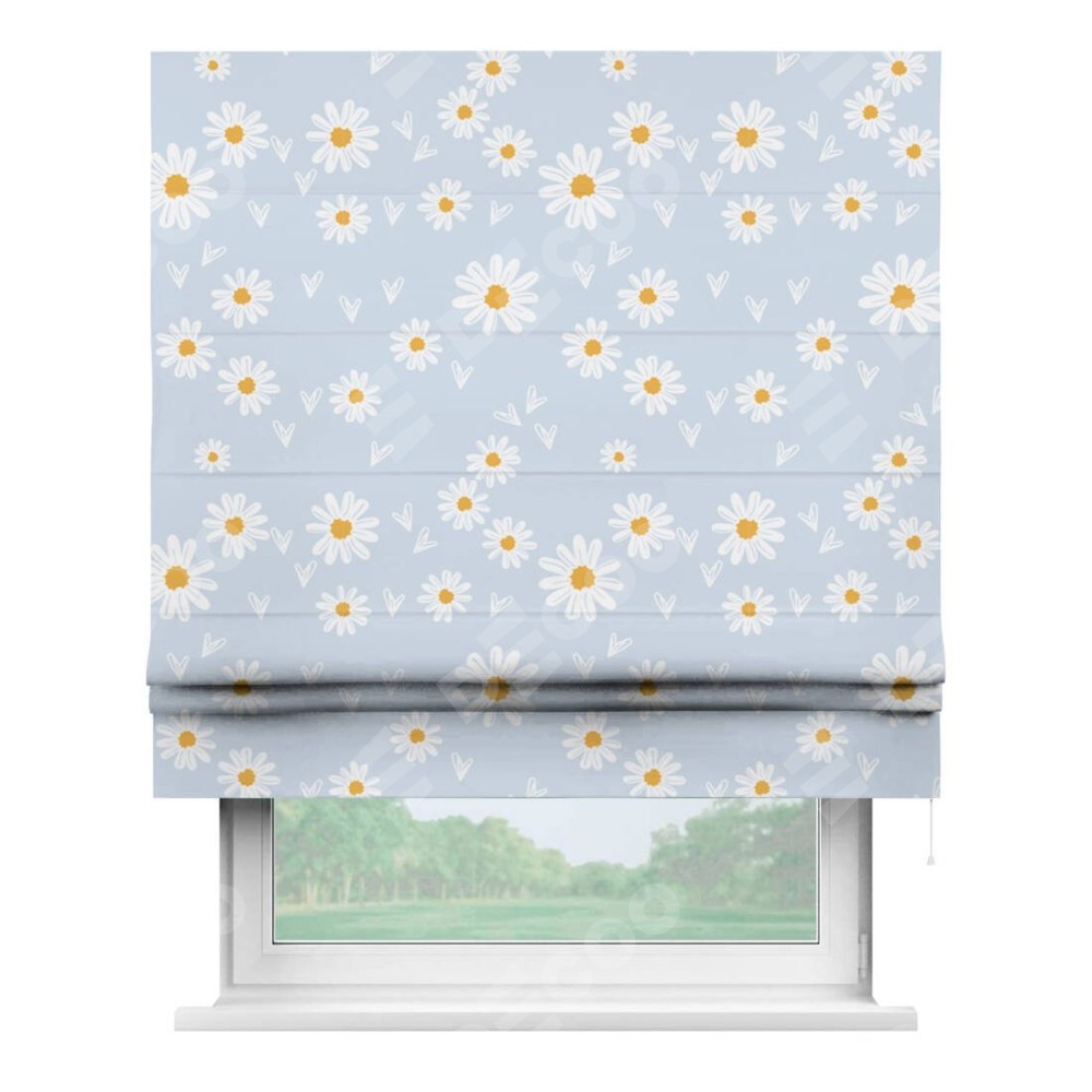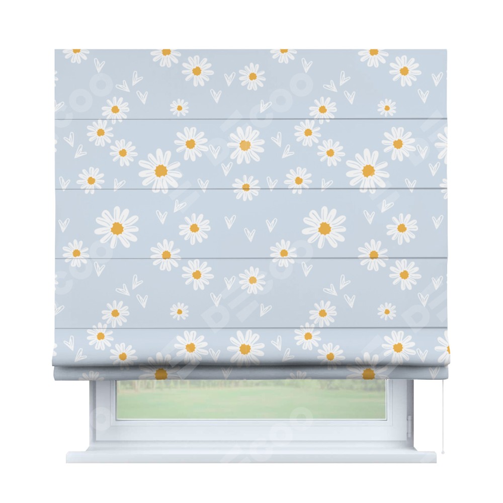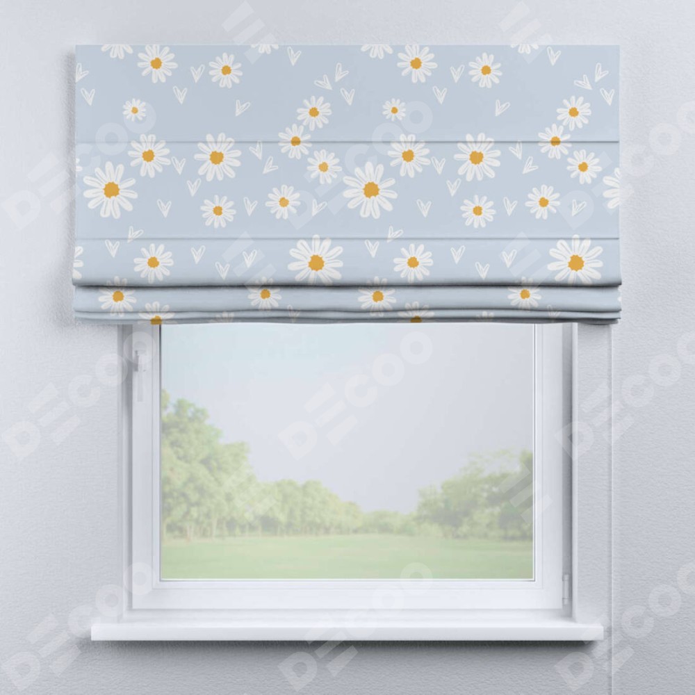 Римская штора производителя «Cortin», используется для проёма, пошита из ткани блэкаут с нанесением сублимационной печати «Летние ромашки». Имеет универсальный механизм и подходит для монтажа: на потолок, на стену и в нишу.