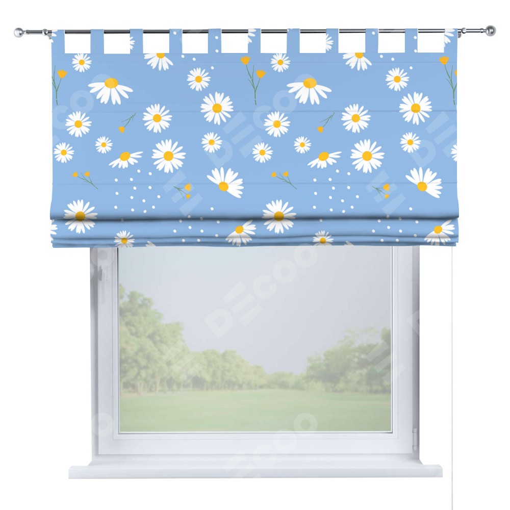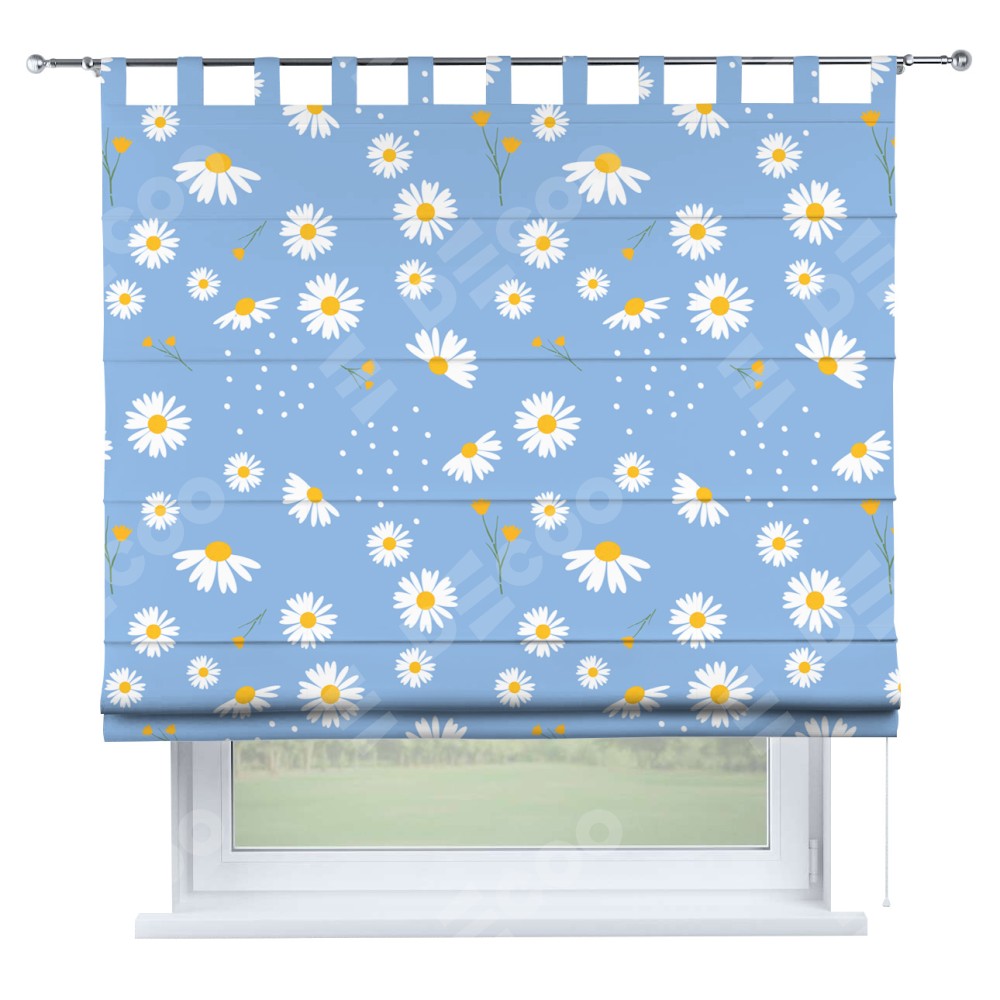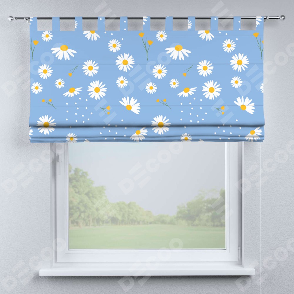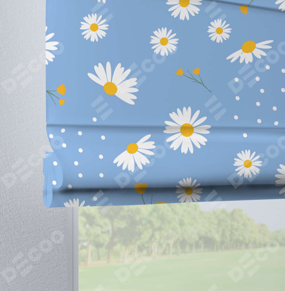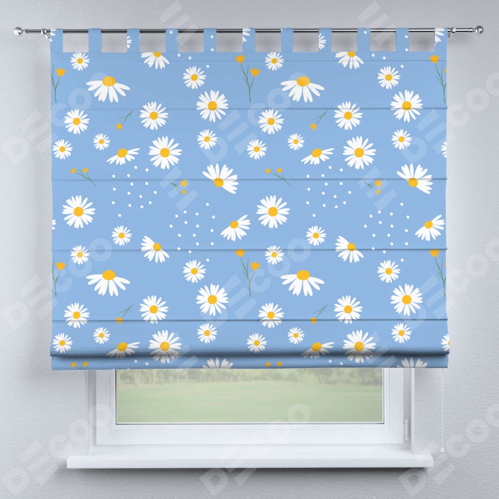 Римская штора производителя «Cortin», используется для проёма, пошита из ткани блэкаут с нанесением сублимационной печати «Ромашки на голубом». Данная модель пошита на петлях, комплектуется на выбор круглым карнизом и подходит для монтажа на стену. Римская штора на петлях имеет простую систему регулировки высоты, отличительным преимуществом данной модели является простой способ монтажа. Достаточно повесить ее на трубу и штора готова!