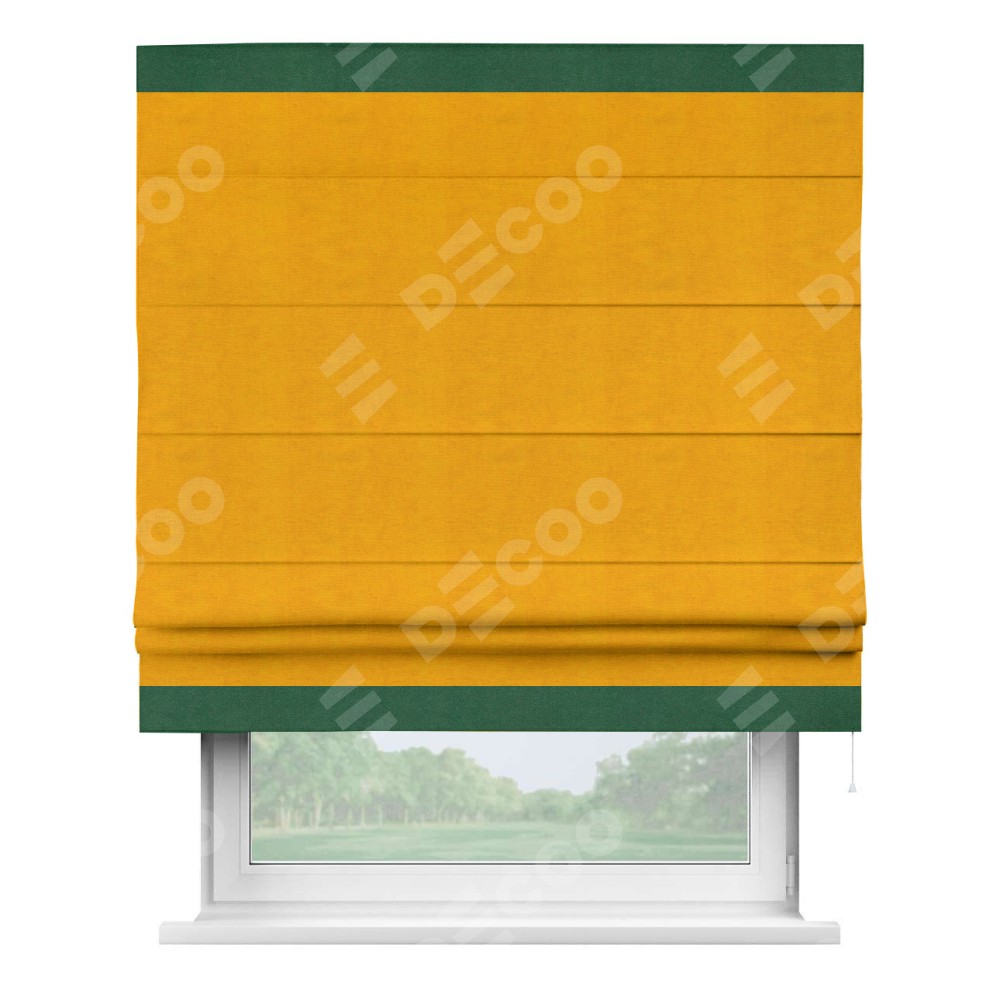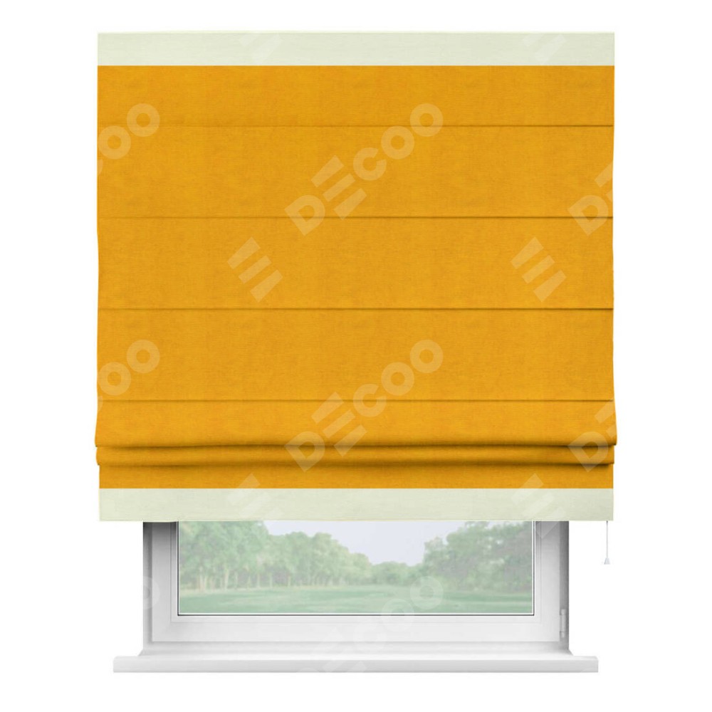 Римская штора производителя «Cortin», используется для проёма, пошита из ткани вельвет желтый, артикул ткани 85547. Отделка шторы кантом «Горизонт», ткань для канта используется из вельвета разной расцветки на выбор. Имеет универсальный механизм и подходит для монтажа: на потолок, на стену и в нишу.