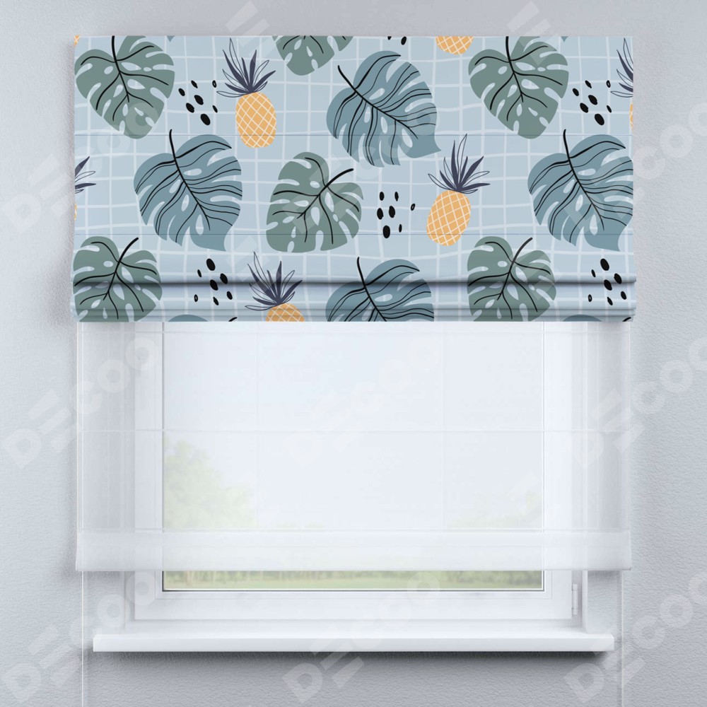 Римская штора день-ночь производителя «Cortin», используется для проёма, пошита из двух полотен, с лицевой блэкаут с нанесением сублимационной печати «Ананасы и листья монстеры», вторая ткань тюль (по стандарту комплектуется тюль белого цвета артикул V-01). Имеет универсальный механизм и подходит для монтажа: на потолок, на стену и в нишу.