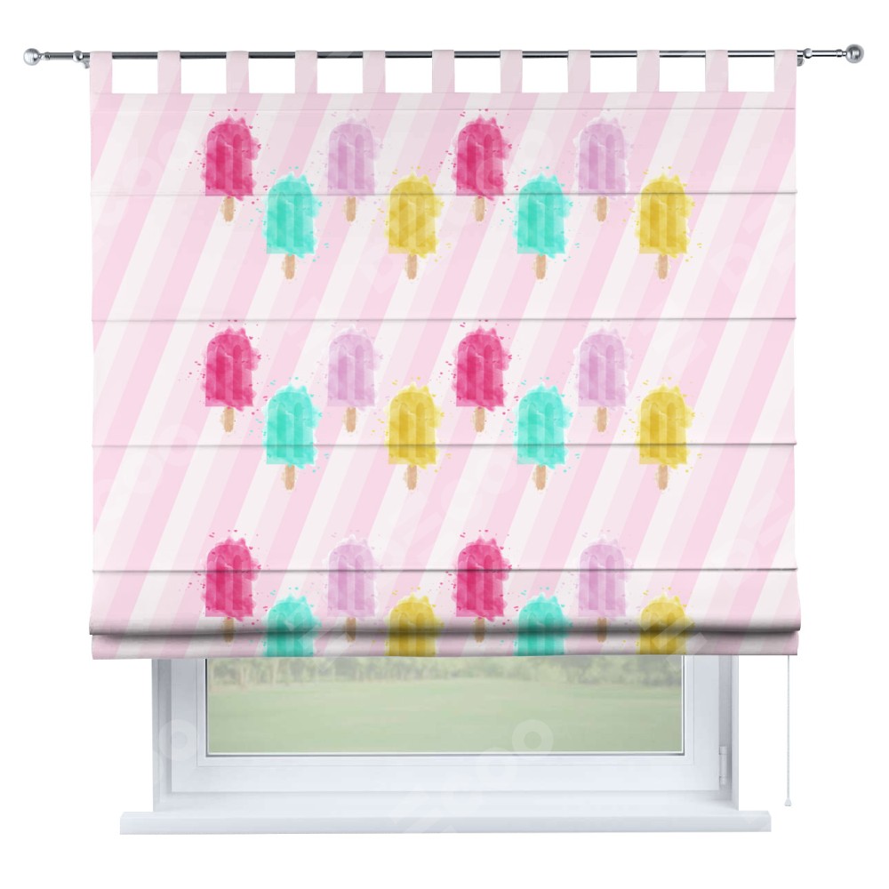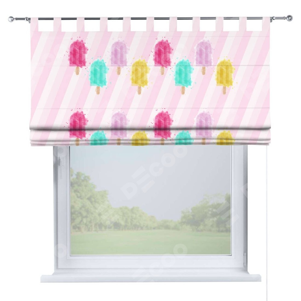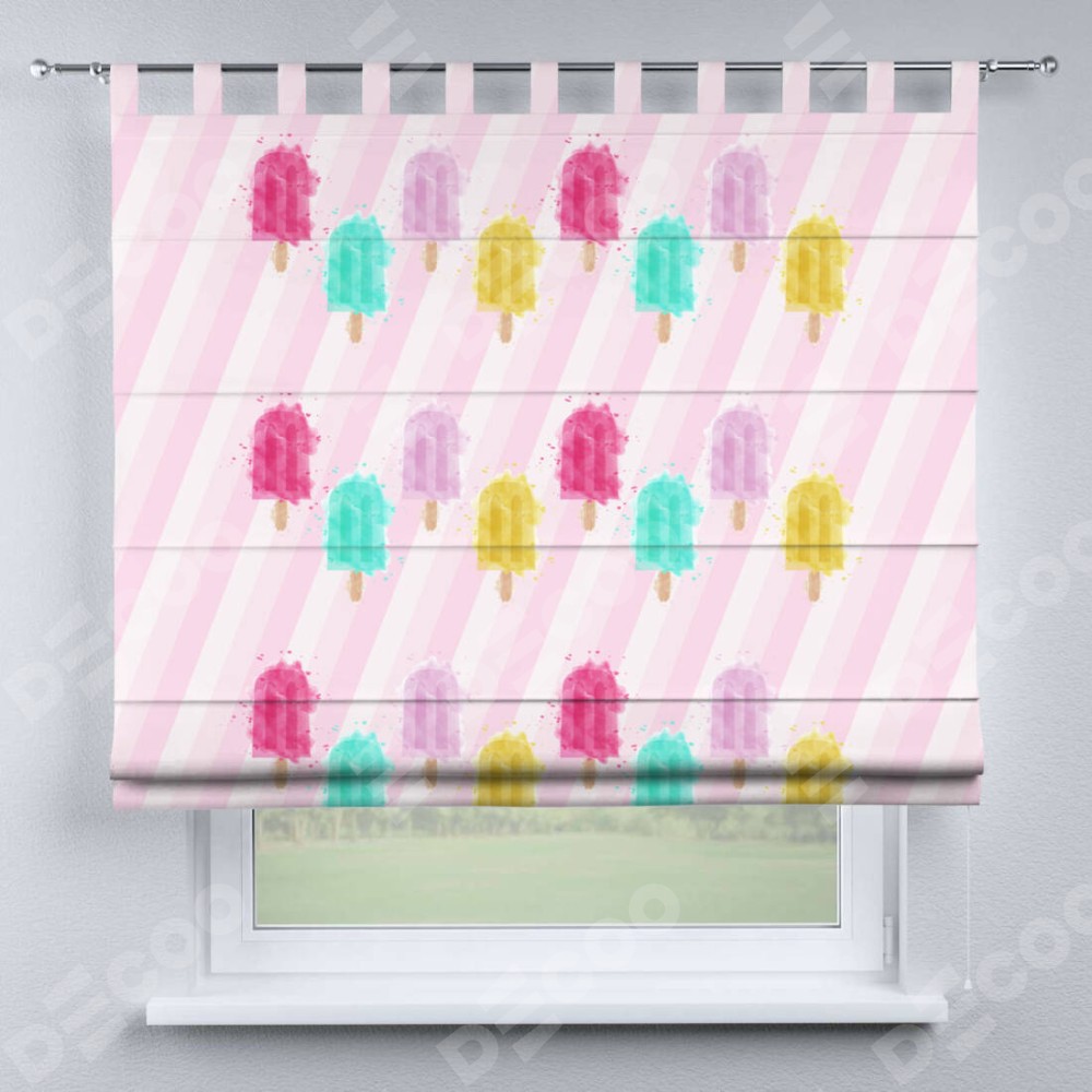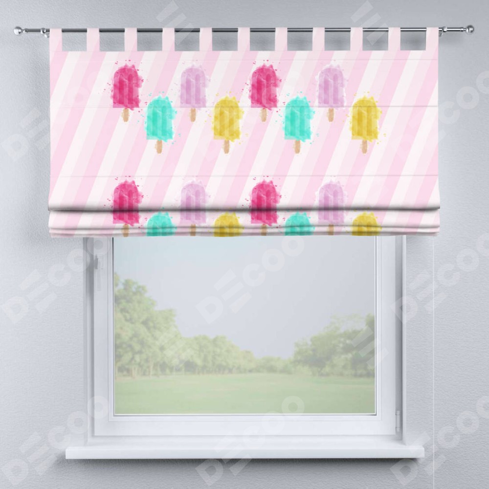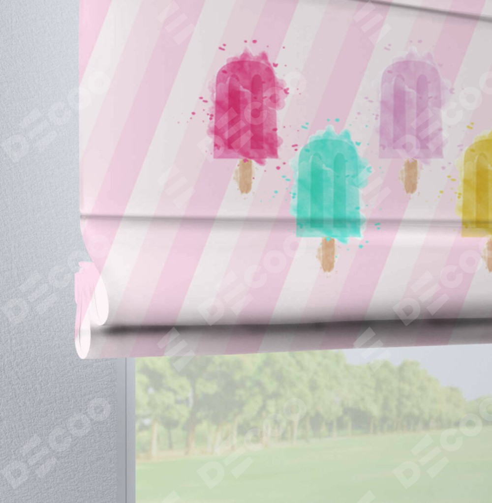 Римская штора производителя «Cortin», используется для проёма, пошита из ткани блэкаут с нанесением сублимационной печати «Фруктовое мороженое». Данная модель пошита на петлях, комплектуется на выбор круглым карнизом и подходит для монтажа на стену. Римская штора на петлях имеет простую систему регулировки высоты, отличительным преимуществом данной модели является простой способ монтажа. Достаточно повесить ее на трубу и штора готова!