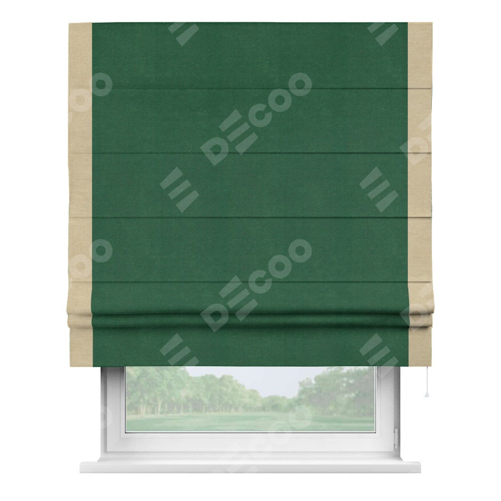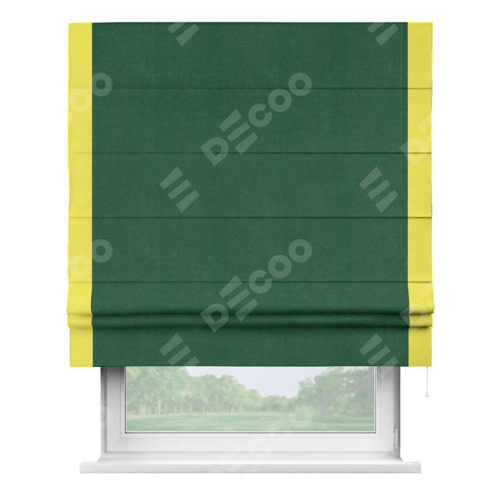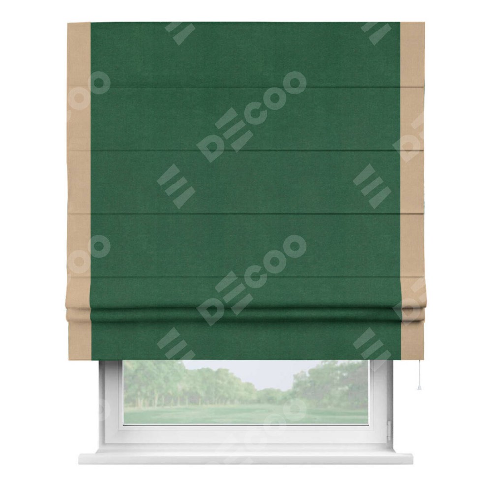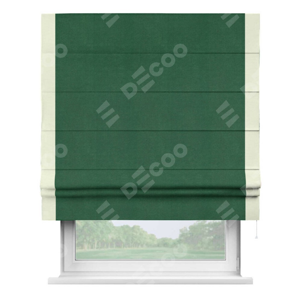 Римская штора производителя «Cortin», используется для проёма, пошита из ткани вельвет зеленый, артикул ткани 85546. Отделка шторы кантом «Стрим Дуо», ткань для канта используется из вельвета разной расцветки на выбор. Имеет универсальный механизм и подходит для монтажа: на потолок, на стену и в нишу.