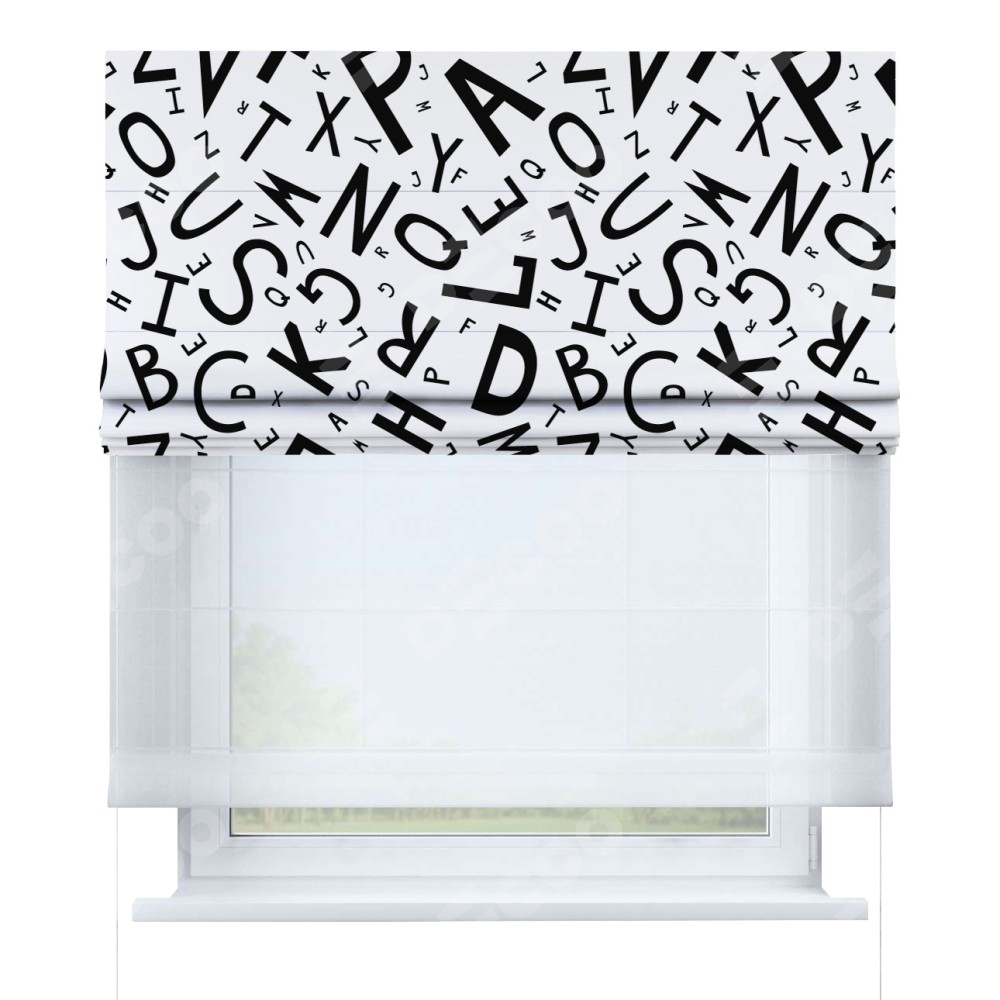 Римская штора день-ночь производителя «Cortin», используется для проёма, пошита из двух полотен, с лицевой блэкаут с нанесением сублимационной печати «Литеры на белом», вторая ткань тюль (по стандарту комплектуется тюль белого цвета артикул V-01). Имеет универсальный механизм и подходит для монтажа: на потолок, на стену и в нишу.