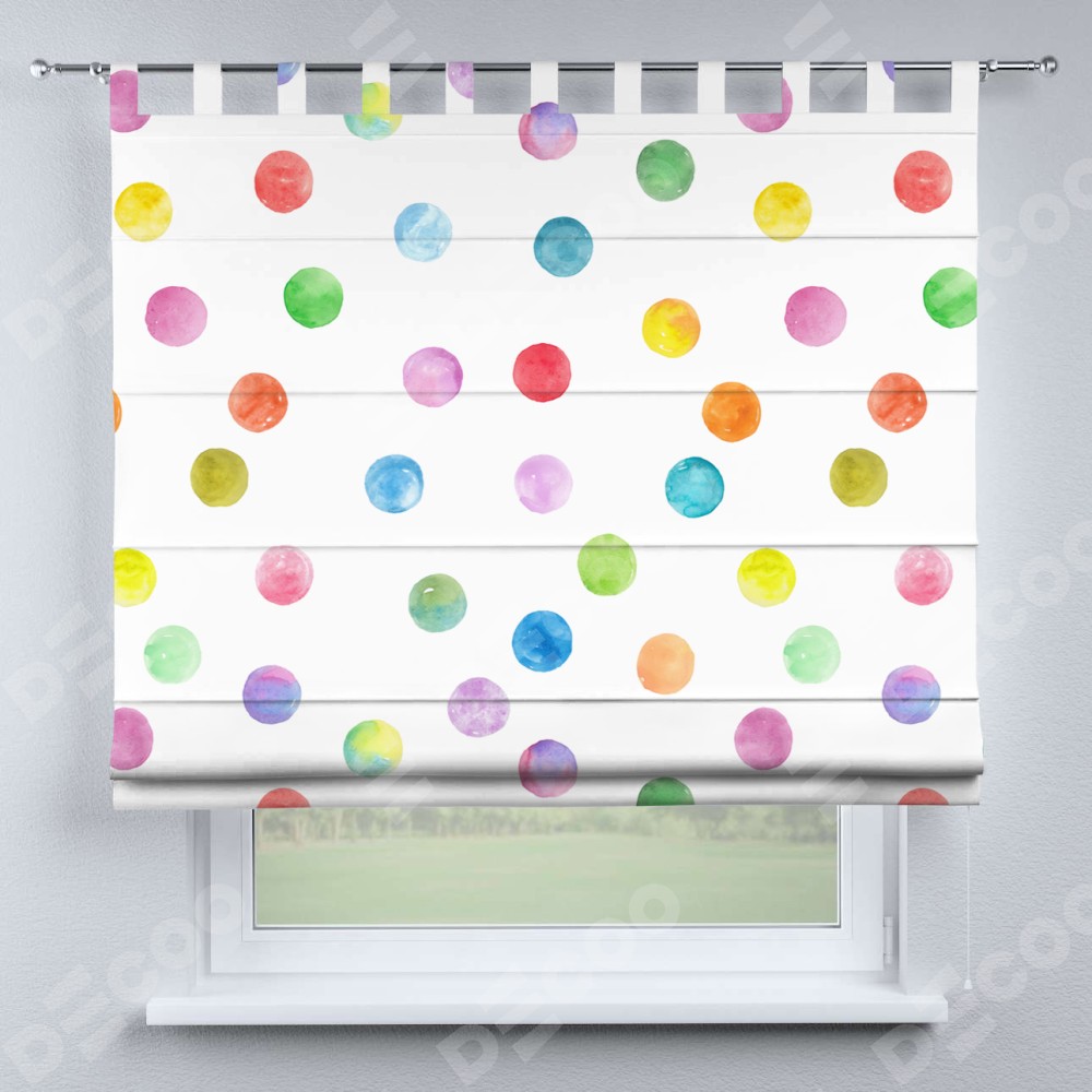 Римская штора производителя «Cortin», используется для проёма, пошита из ткани блэкаут с нанесением сублимационной печати «Цветные круги». Данная модель пошита на петлях, комплектуется на выбор круглым карнизом и подходит для монтажа на стену. Римская штора на петлях имеет простую систему регулировки высоты, отличительным преимуществом данной модели является простой способ монтажа. Достаточно повесить ее на трубу и штора готова!