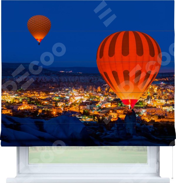 Римская штора производителя «Cortin», используется для проёма, пошита из ткани блэкаут с нанесением сублимационной печати «Воздушные шары в небе». Имеет универсальный механизм и подходит для монтажа: на потолок, на стену и в нишу.
