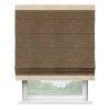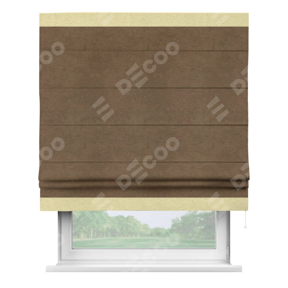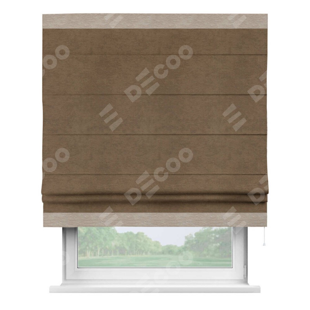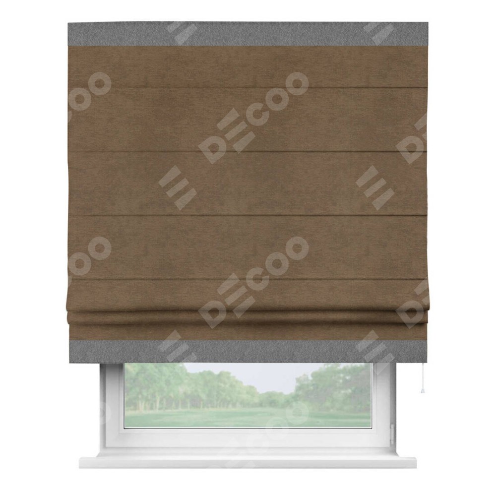 Римская штора производителя «Cortin», используется для проёма, пошита из ткани софт однотонный бронзовый, артикул 33099. Отделка шторы кантом «Горизонт», ткань для канта используется из софта разной расцветки на выбор. Имеет универсальный механизм и подходит для монтажа: на потолок, на стену и в нишу.