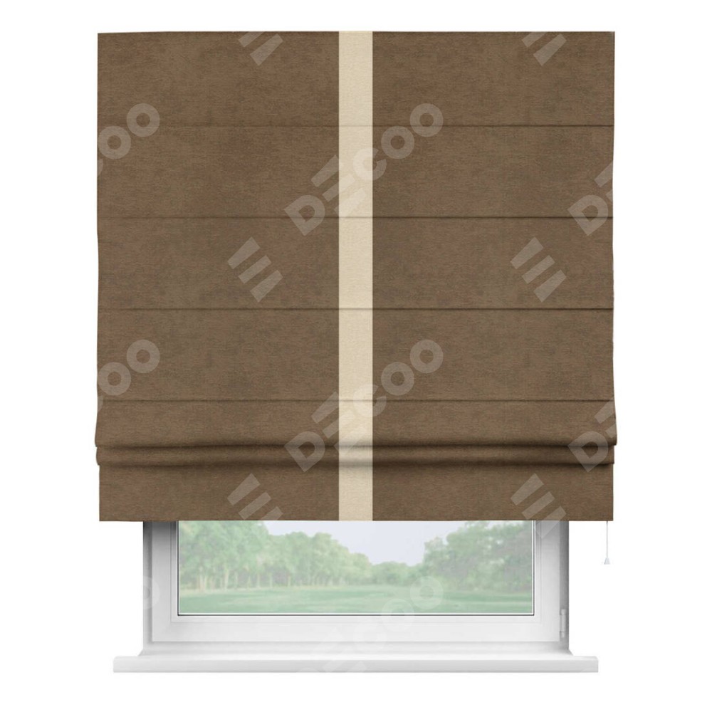 Римская штора производителя «Cortin», используется для проёма, пошита из ткани софт однотонный бронзовый, артикул 33099. Отделка шторы кантом «Хайвэй», ткань для канта используется из софта разной расцветки на выбор. Имеет универсальный механизм и подходит для монтажа: на потолок, на стену и в нишу.
