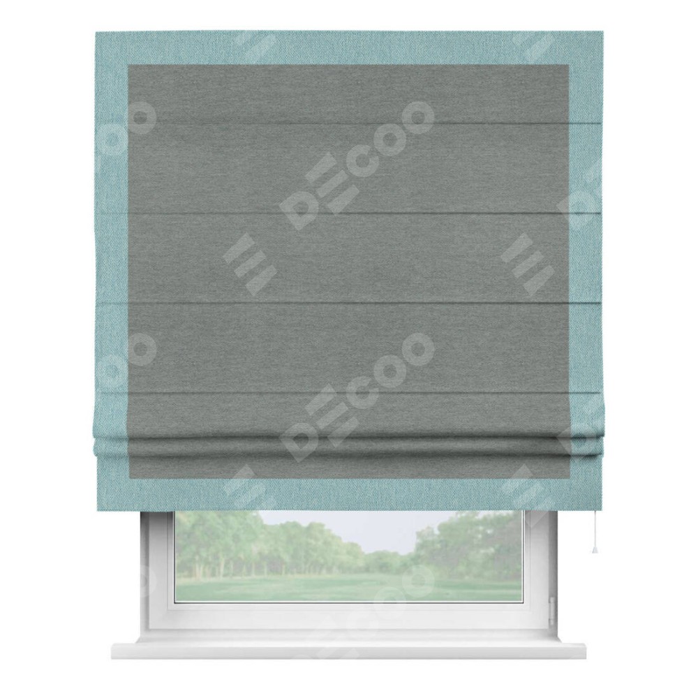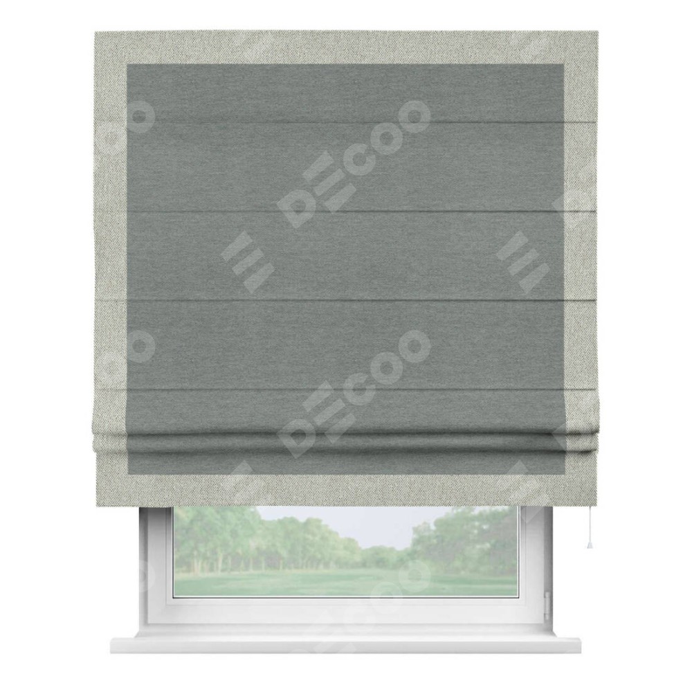 Римская штора производителя «Cortin», используется для проёма, пошита из ткани твид блэкаут серый, артикул 21577. Отделка шторы кантом «Чесс», ткань для канта используется из твида разной расцветки на выбор. Имеет универсальный механизм и подходит для монтажа: на потолок, на стену и в нишу.